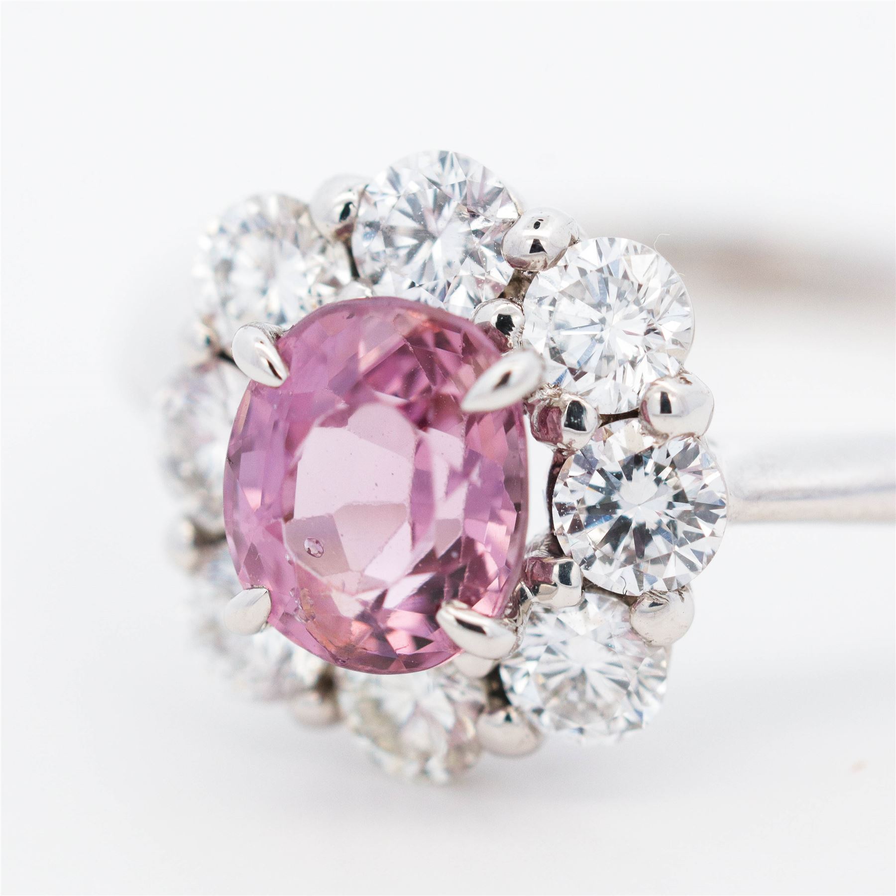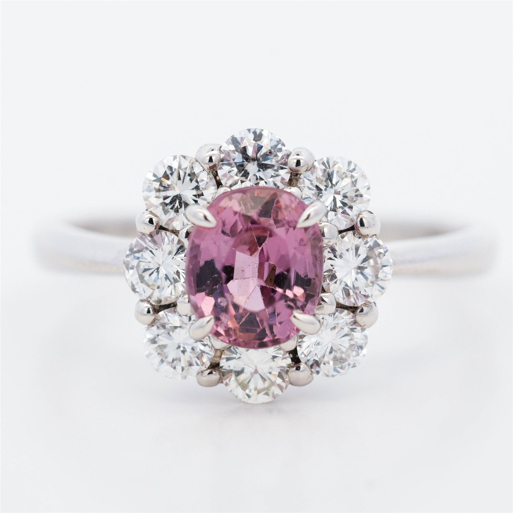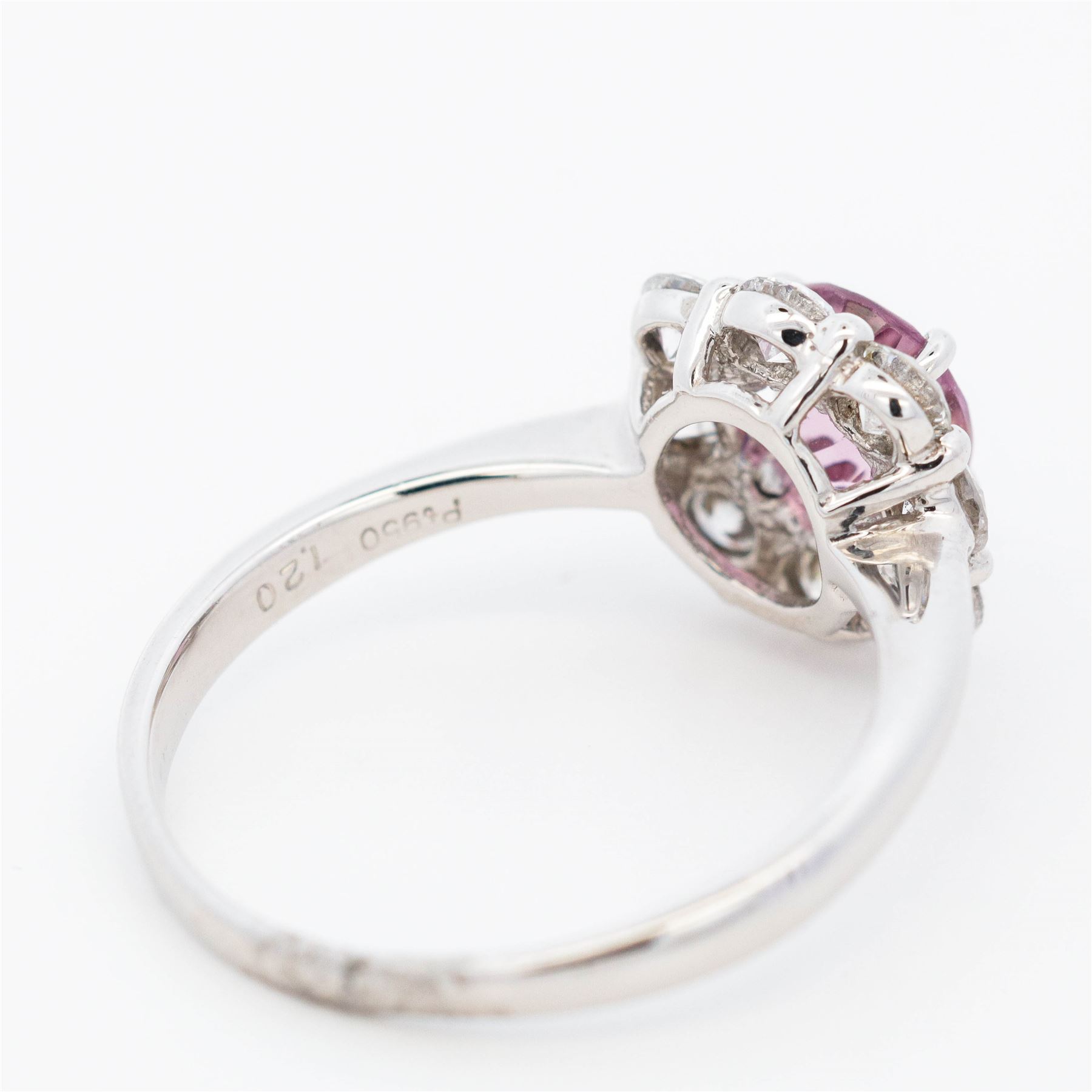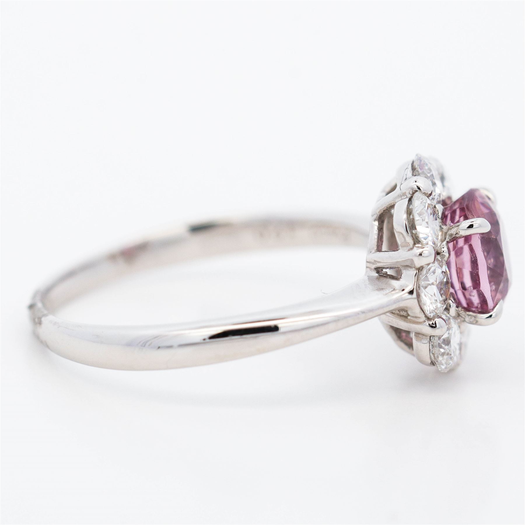 Crafted in high-fineness platinum, the ring centers a 1.20 ct oval mixed-cut spinel of delicate violet-pink hue, certified by MTGL (No. 10108714) as natural Burmese origin with no indications of heat. The gem is secured by four claw prongs and framed by a scalloped halo of near-colourless round brilliant diamonds that provide a calculated 0.82 ctw, graded about F-G colour and VS clarity. A low pierced basket gallery maximises light return while keeping the profile refined, and a high-polish cathedral shank gives sturdy support. Workmanship is crisp; all stones are tight and the piece shows minimal wear.