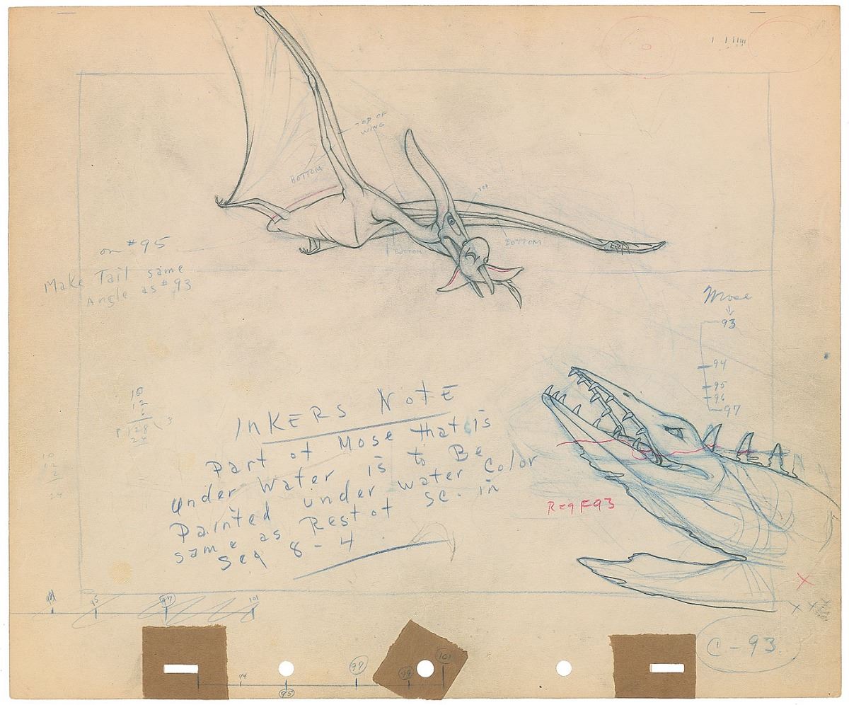 (Walt Disney Studios, 1940) Terrific original production drawing of two dinosaurs from Fantasia, showing a soaring pterodactyl and a lurking kronosaurus during the film’s epic The Rite of Spring sequence. Drawing includes several artist notations and directions. Accomplished in graphite and colored pencil on untrimmed 12 x 10 animation paper. Images measure 6.5 x 4.5 and 4.25 x 3.5. In fine condition. A dangerously appealing drawing.