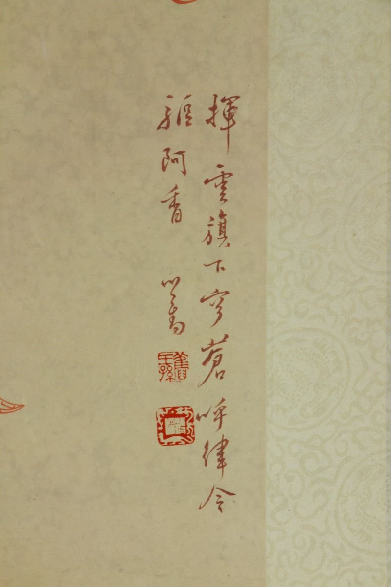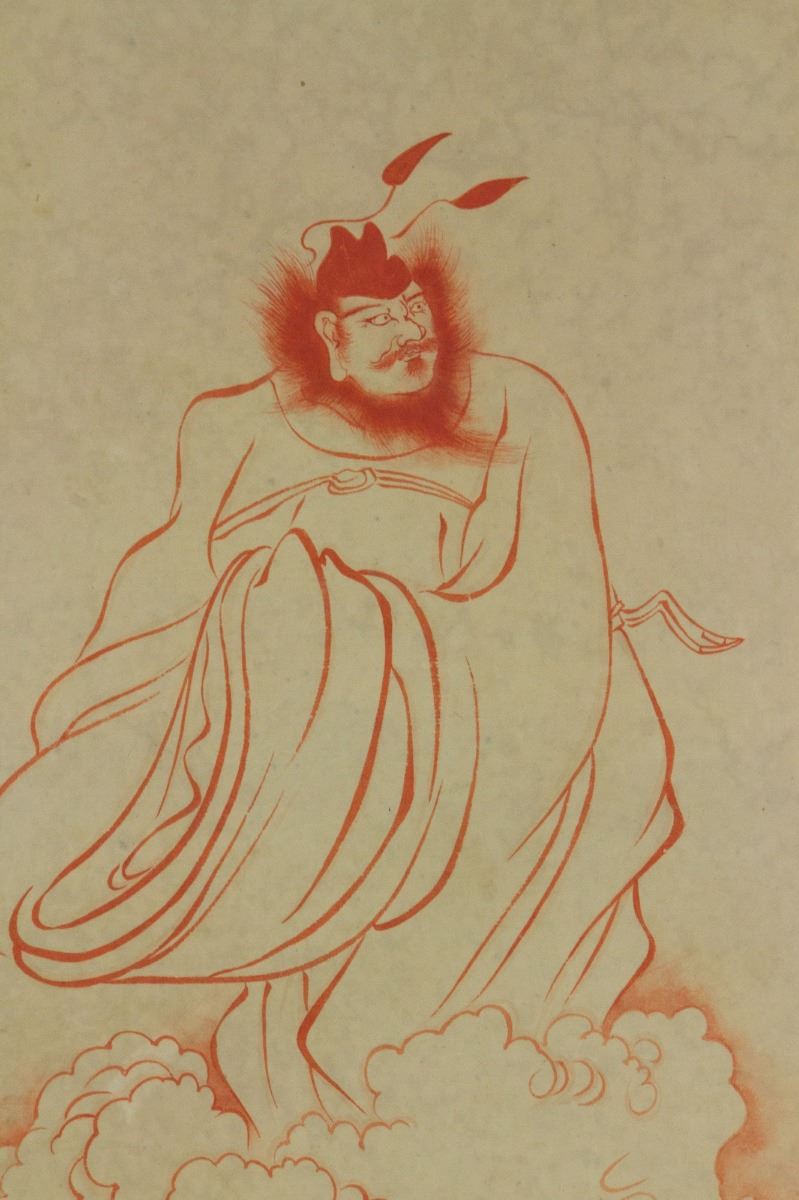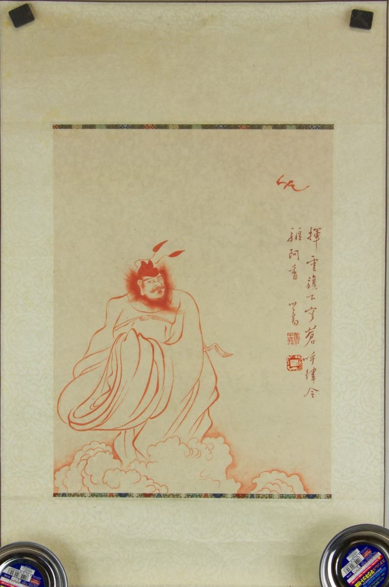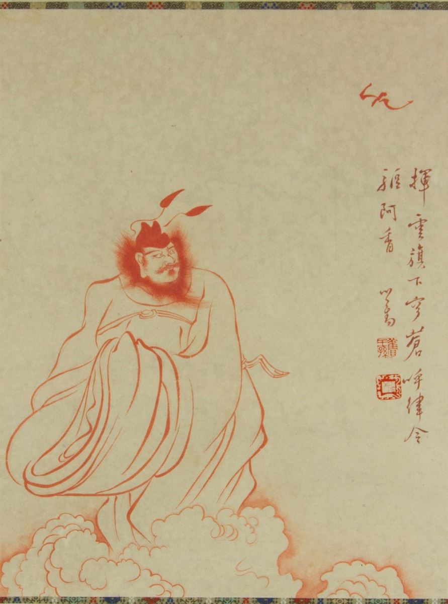 Portrait of Zhong Kui, standing on cloud; Chinese red ink and watercolour on paper roll; signed Pu Ru (1896-1963); inscribed with 2 artist seals; 42.5 cm × 32 cm