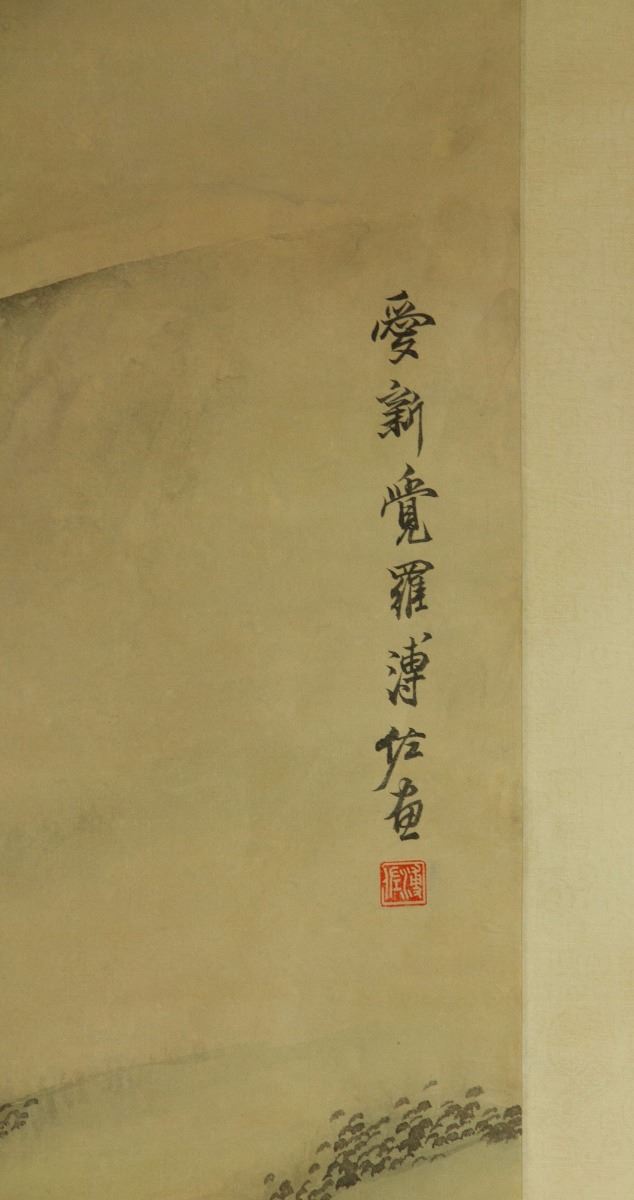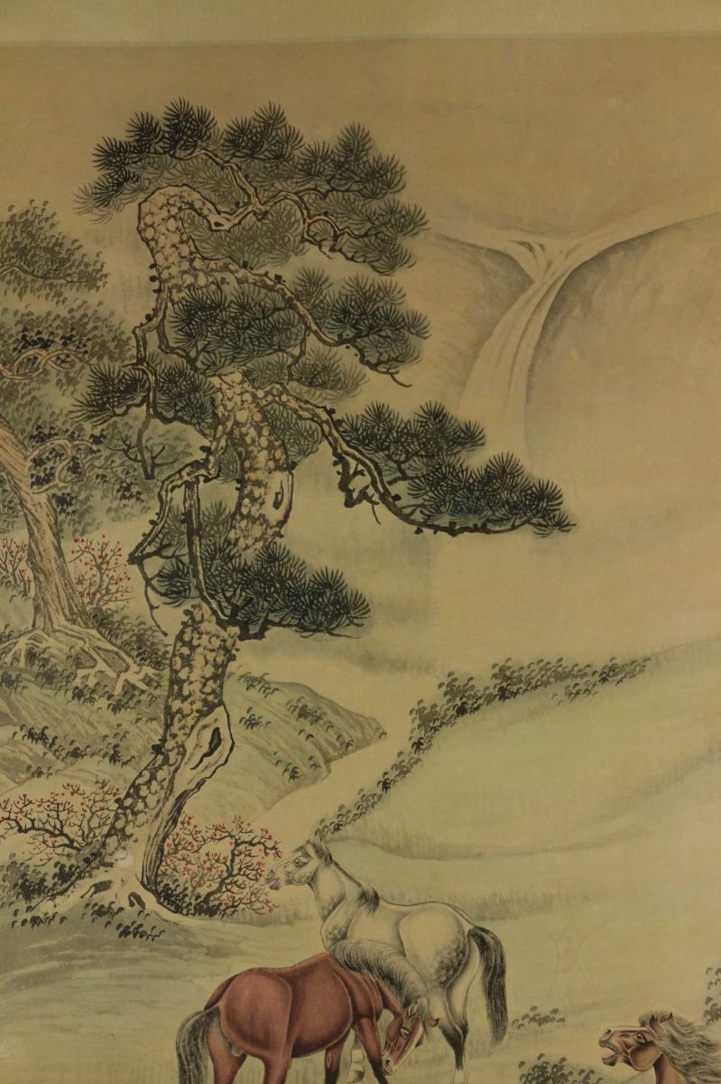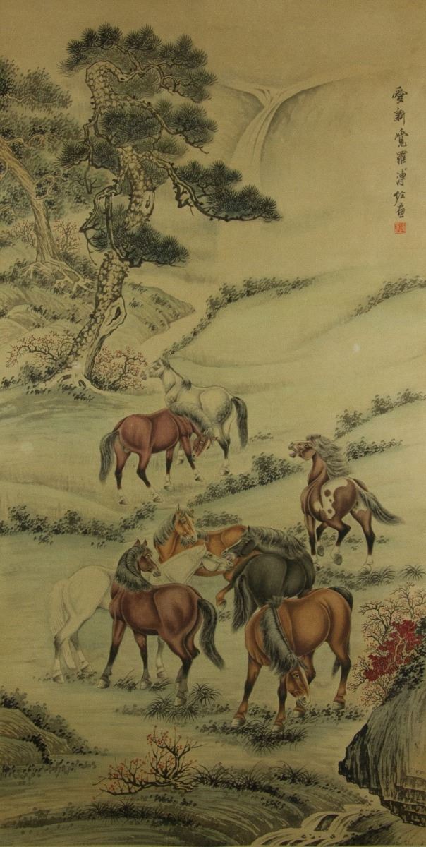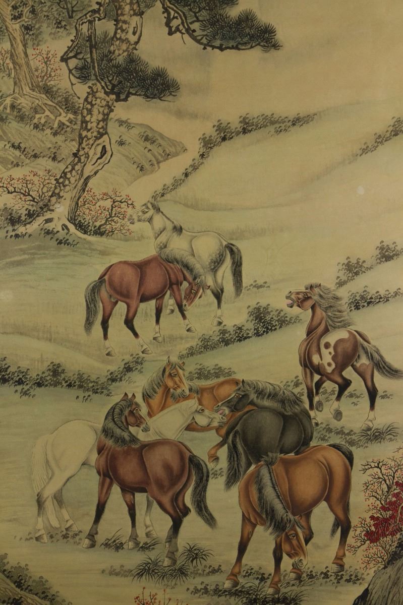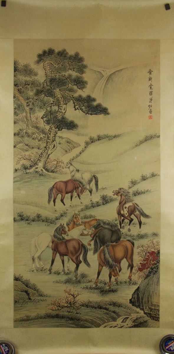 Mountainous landscape and 8 horses sporting on grass; Chinese ink and watercolour on paper roll; signed Pu Zuo (1918-2001); inscribed with 1 artist seal; 134 cm × 65 cm