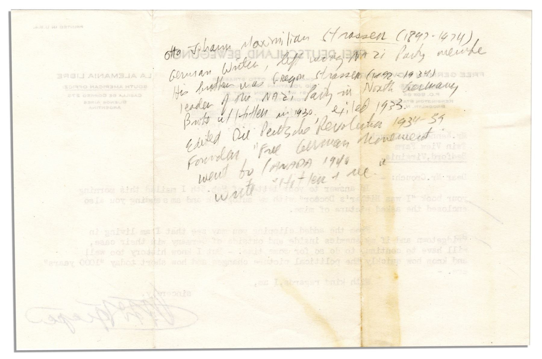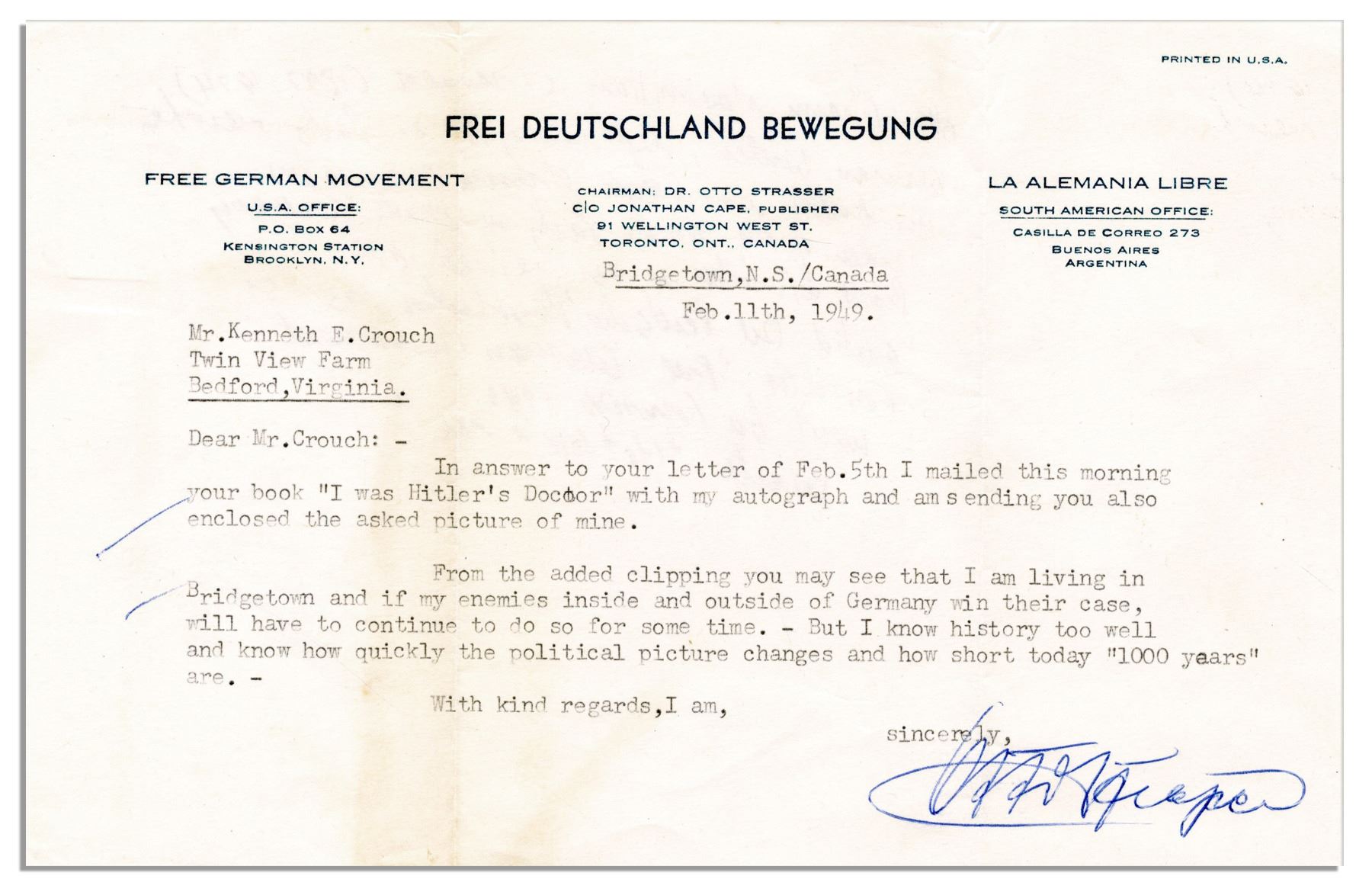 Otto Strasser, a Nazi who broke with Hitler and was declared ''Public Enemy Number One,'' by Joseph Goebbels, signs a typed letter, dated 11 February 1949 from Nova Scotia, where he was in exile. Strasser writes to a man in Bedford, Virginia that he has sent a copy of his book, ''I Was Hitler's Doctor'' and a signed photograph. He adds, ''...I am living in Bridgetown and if my enemies inside and outside of Germany win their case, will have to continue to do so for some time. But I know history too well and know how quickly the political picture changes and how short today '1000 years' are...'' Nazis, of course, referred to their rule as the 1000-year Reich. He signs, ''Otto Strassser''. Minor toning to 8.5'' x 5.5'' letter, else near fine.
