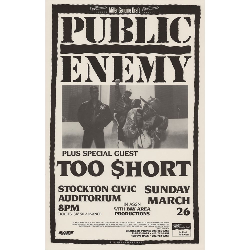 Original 14 x 22 poster for a Public Enemy concert at the Stockton Memorial Civic Auditorium in Stockton, California, on March 26, 1989. The poster shows three rappers, including Chuck D and Flavor Flav, and lists the special guest as Too $hort. In fine condition.