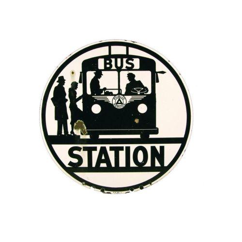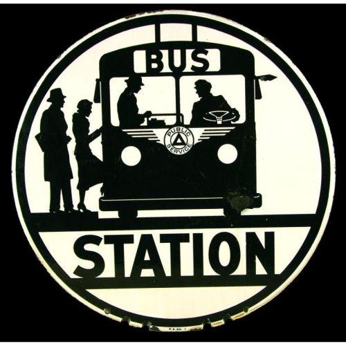 Public Service Bus Station Porcelain Sign. Some minor chips on the front and back, otherwise very good condition. 16 inch diameter.