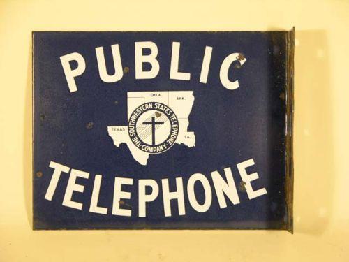 "Public Telephone" porcelain/die cut sign/United Utilities System/original bracket for hanging. 25.5" x 27" Ex. cond.