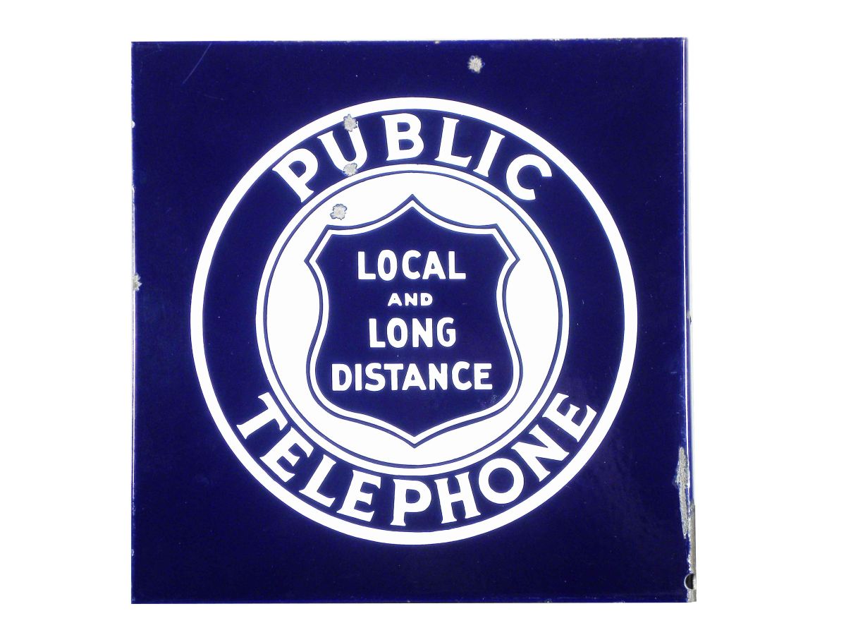 Public Telephone Two Side Porcelain Flange Sign. Local/Long Distance Shield. Three small chips on one side, four on opposite otherwise very good condition. 10 X 10 inches.