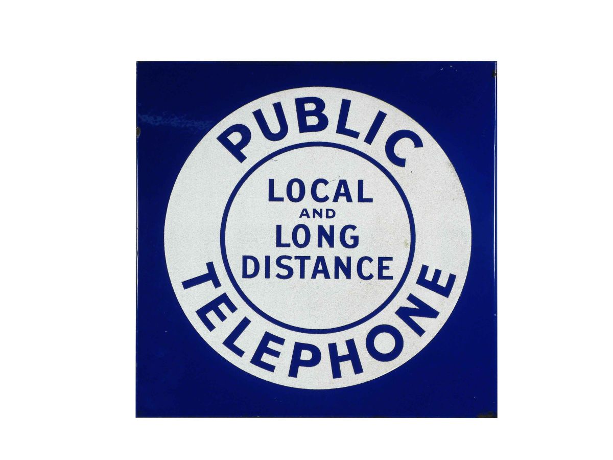Public Telephone Two Sided Porcelain Flange Sign. Local/Long Distance with reflective paint. Some discoloration on one side otherwise very good condition. 14 X 14 inches.