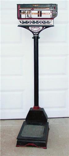 Public Weigher Scale. This is the only item for which Charles Fey was issued a patent. It is in nice condition with a minor piece missing from the right side of the weight bar.