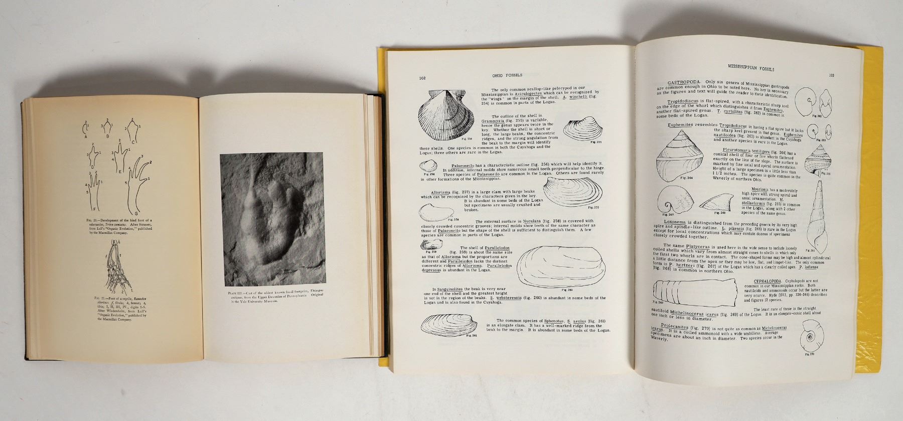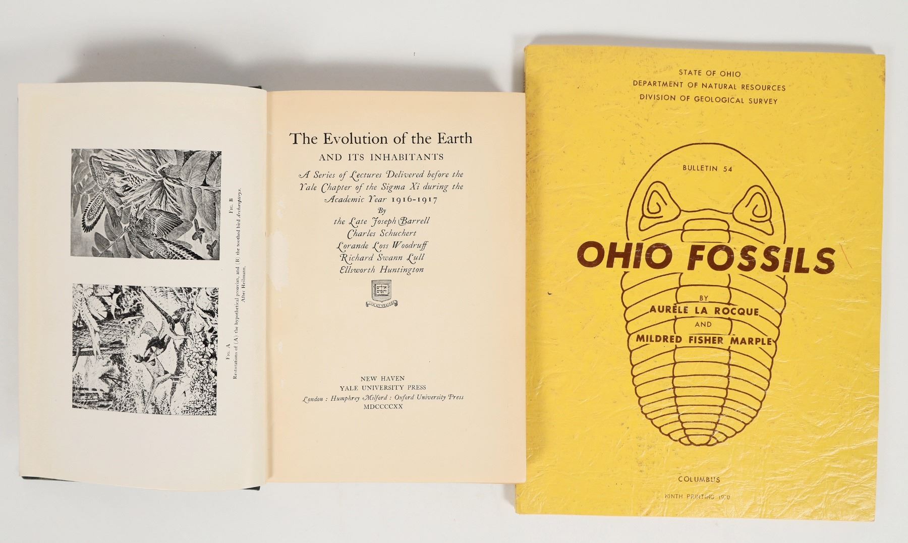 A pair of publications on natural history: 'The Evolution of the Earth' (1918), a collection of lectures delivered to Sigma Xi at Yale, and 'Ohio Fossils' (1970) by Aurele la Rocque and Mildred Fisher Marple at the State of Ohio Department of Natural Resources. See photos.