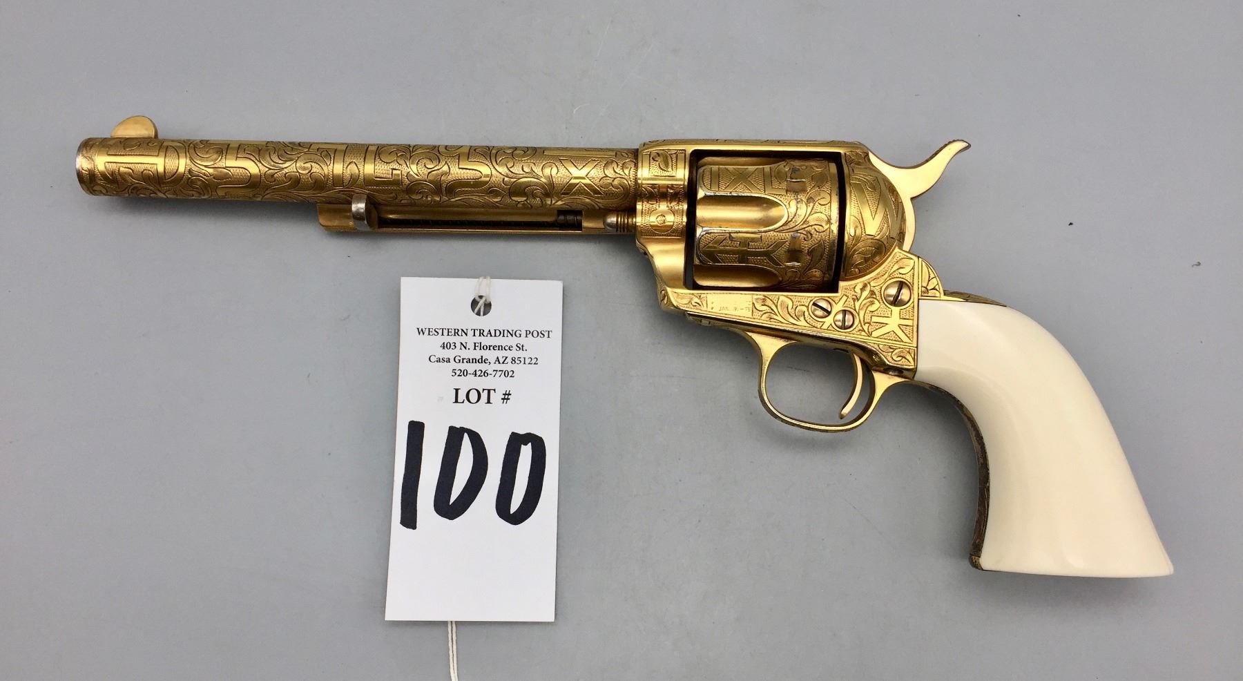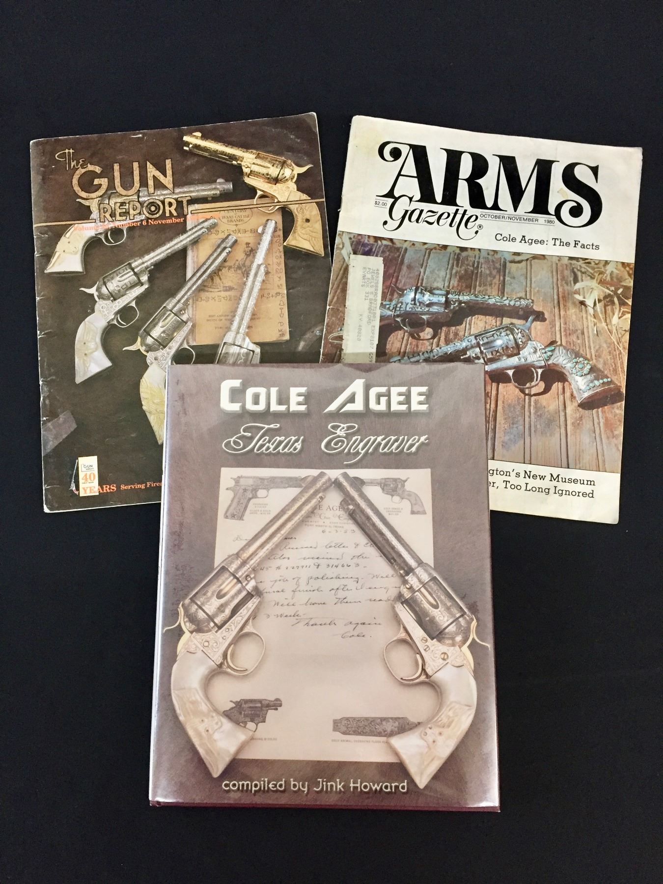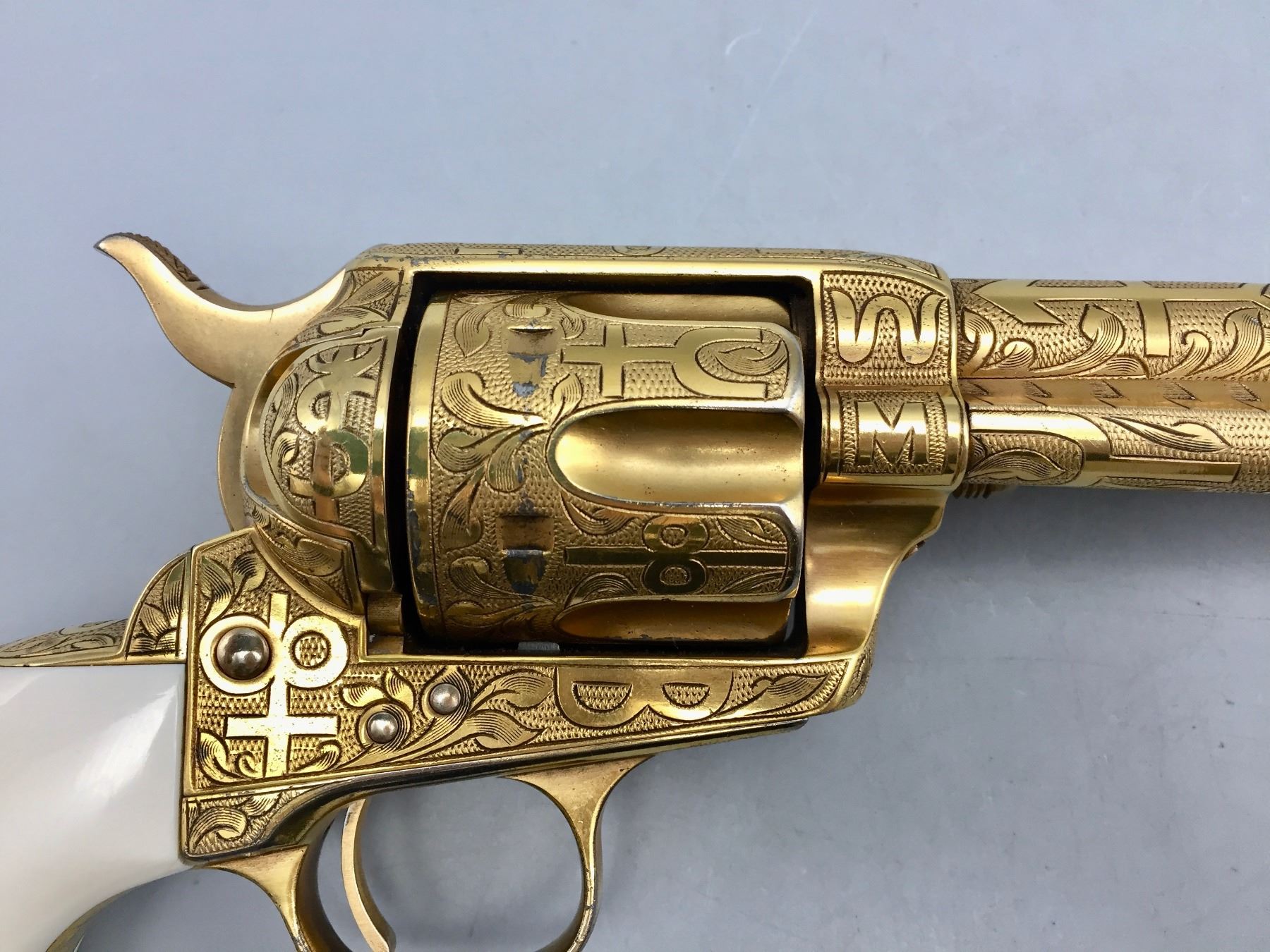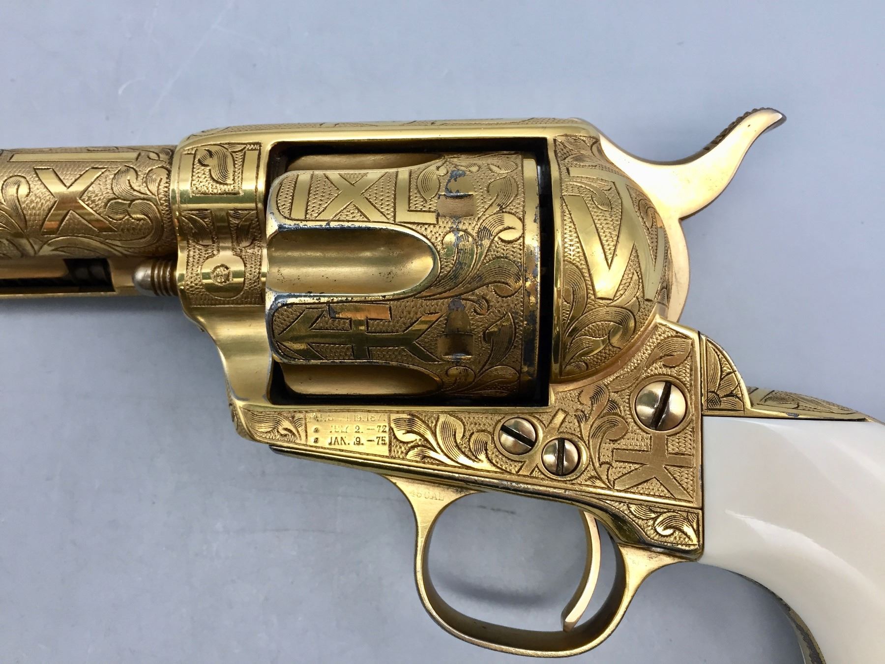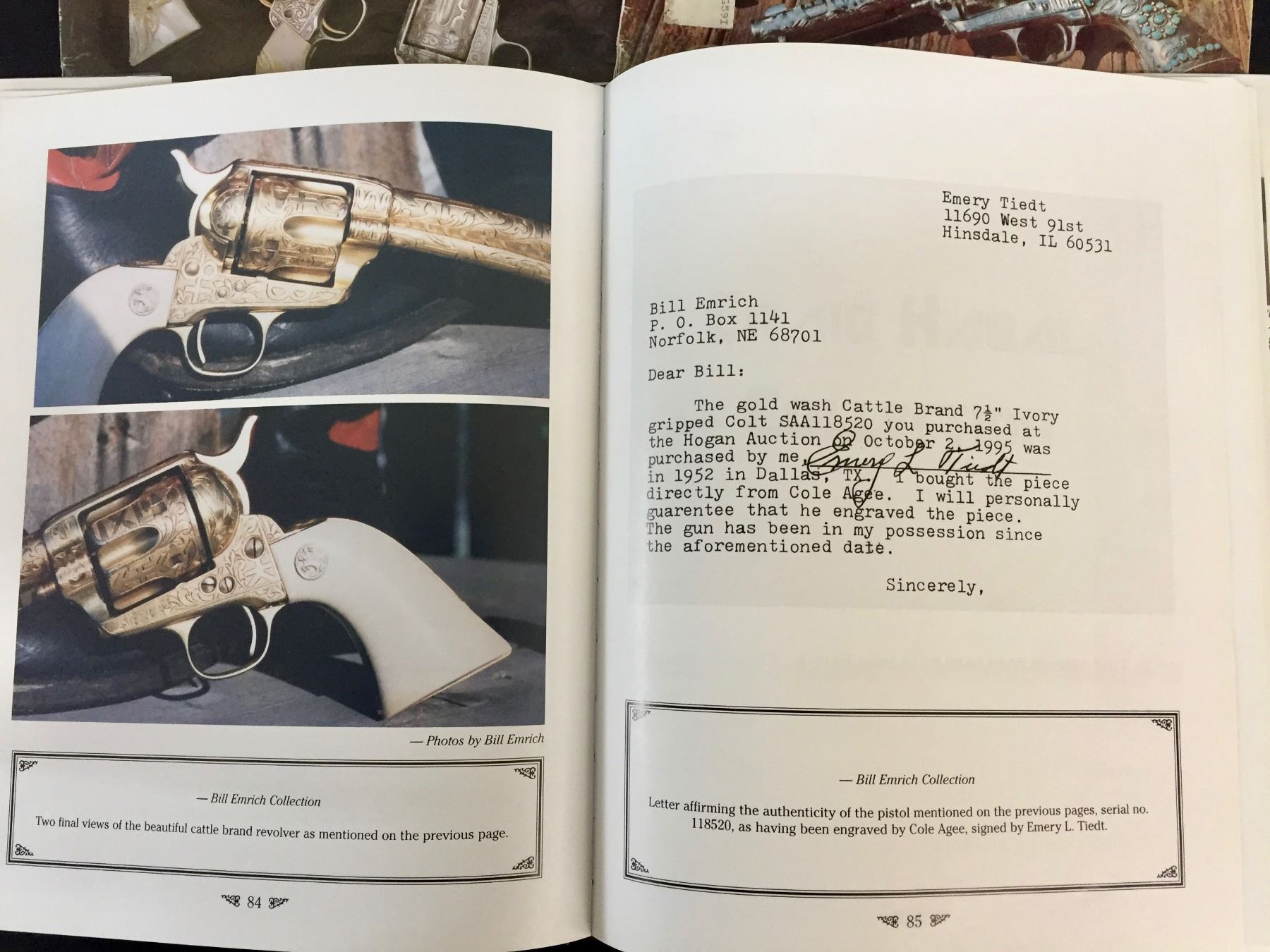 Description: For your bidding enjoyment is this Cole Agee Engraved Colt Single Action Revolver. This revolver features the signature Cole Agee, “Brands” engraving with fossilized ivory grips. This Colt is the exact same one that is published on pages 82 - 85 of the, Cole Agee, Texas Engraver book. It also comes with the book and a couple of magazines that speak about Cole Agee. Also include is the original letter published on P. 85 of the book which gives ownership information regarding this engraved Colt. Maker: Colt firearms co. and engraved by Cole Agee. Approx. Age: Pistol is 1886, engraving done sometime between 1920 and 1955. Size: 7” barrel. Condition: Pretty good for its age, some wear expected. Some of the gold plating is rubbing thin in places from people cycling it and other minor wear. Please look closely at the pictures - they are an important part of our description. Shipping: There will be a $10 handling / packaging fee for shipping this lot. The actual cost of postage will be added on top of that.