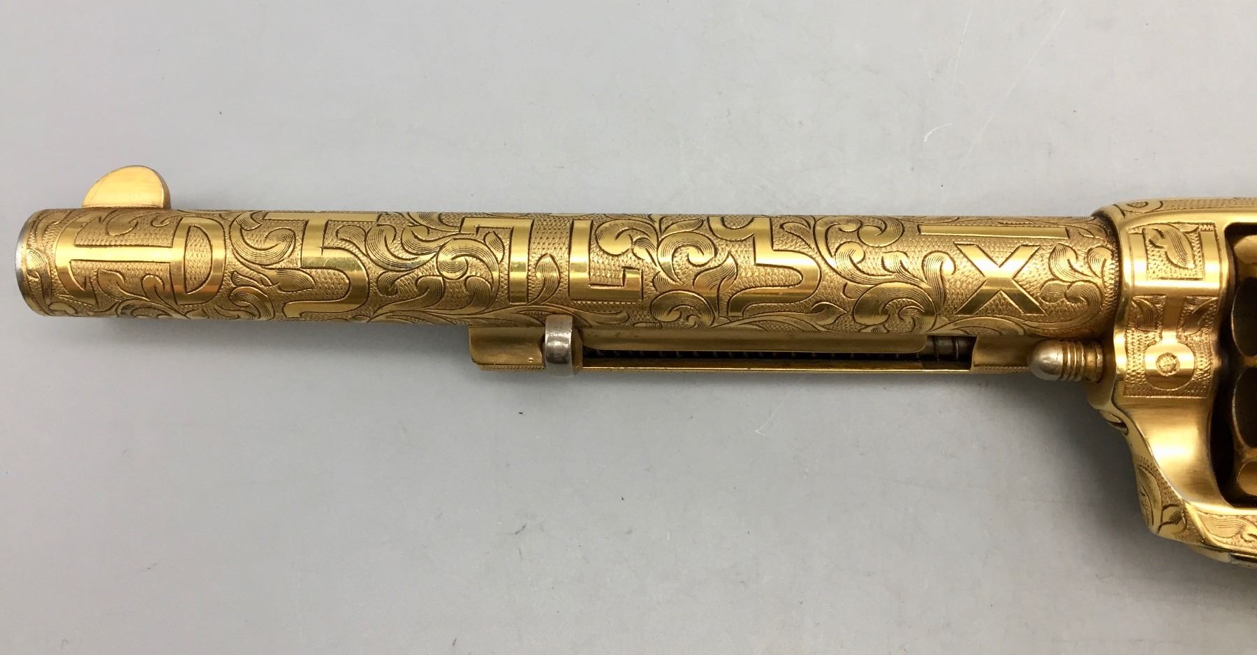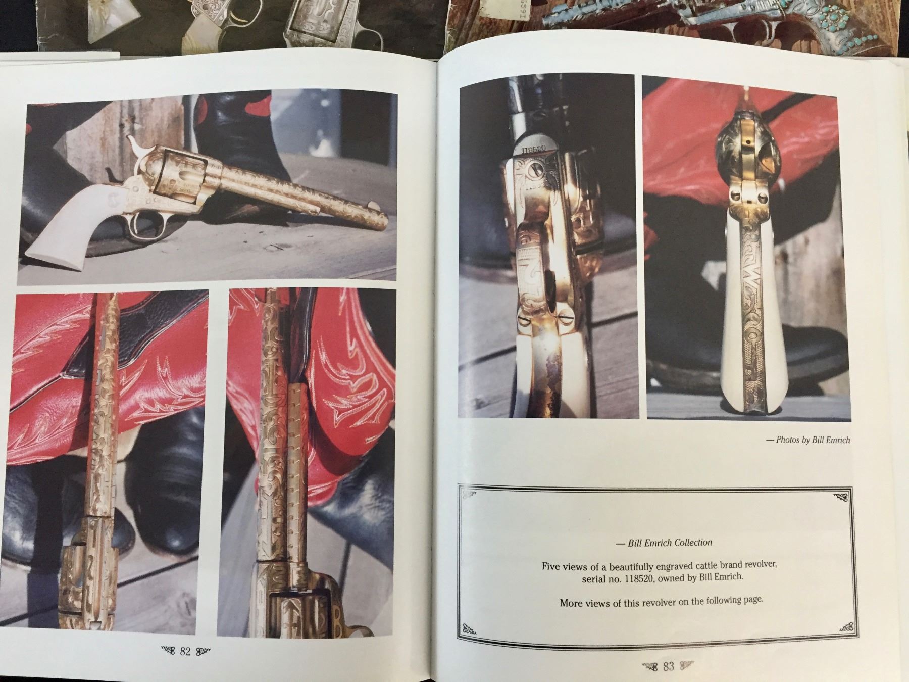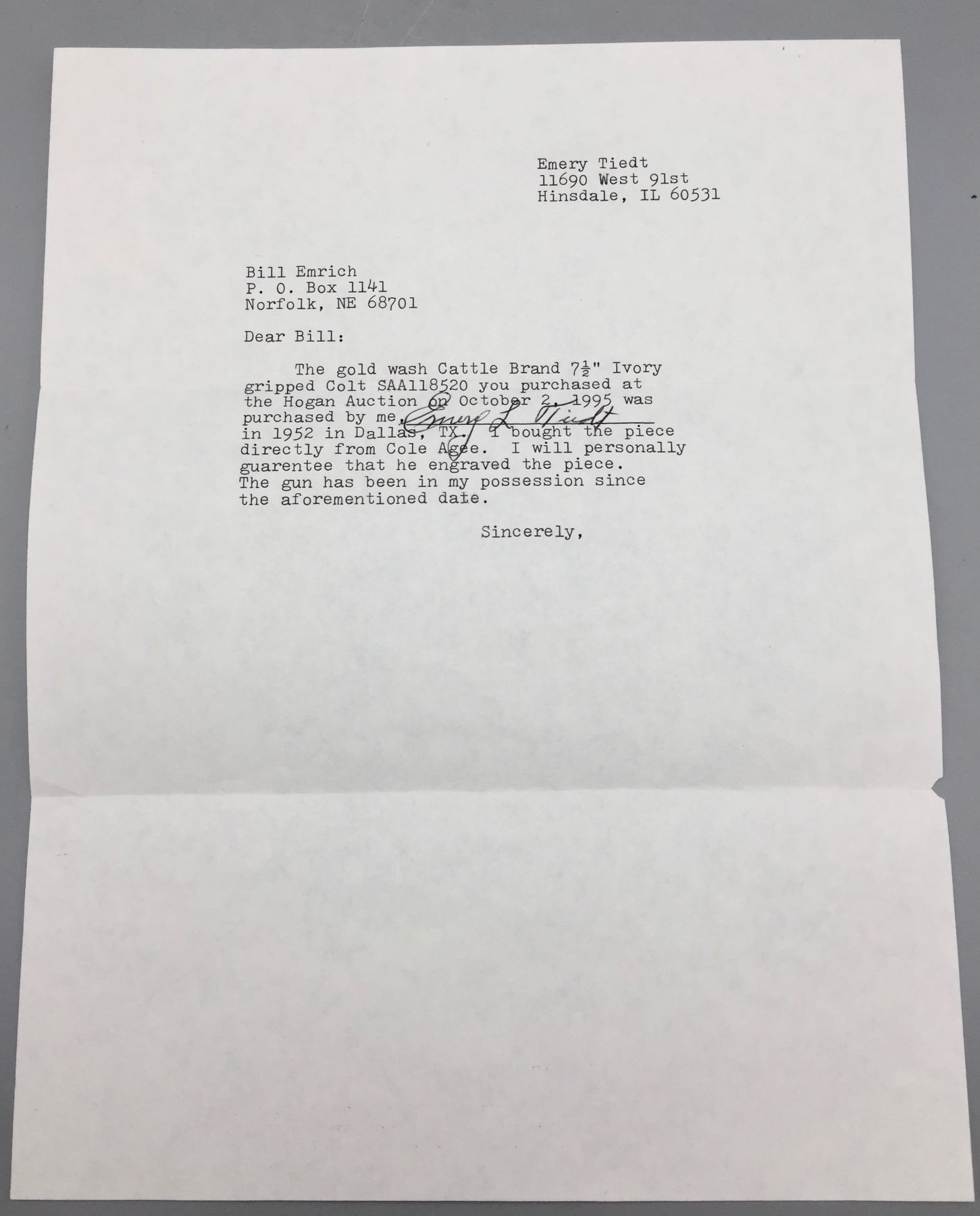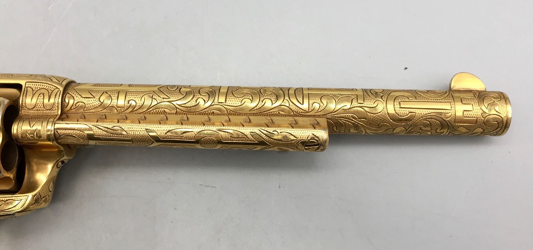 Description: For your bidding enjoyment is this Cole Agee Engraved Colt Single Action Revolver. This revolver features the signature Cole Agee, “Brands” engraving with fossilized ivory grips. This Colt is the exact same one that is published on pages 82 - 85 of the, Cole Agee, Texas Engraver book. It also comes with the book and a couple of magazines that speak about Cole Agee. Also include is the original letter published on P. 85 of the book which gives ownership information regarding this engraved Colt. Maker: Colt firearms co. and engraved by Cole Agee. Approx. Age: Pistol is 1886, engraving done sometime between 1920 and 1955. Size: 7” barrel. Condition: Pretty good for its age, some wear expected. Some of the gold plating is rubbing thin in places from people cycling it and other minor wear. Please look closely at the pictures - they are an important part of our description. Shipping: There will be a $10 handling / packaging fee for shipping this lot. The actual cost of postage will be added on top of that.