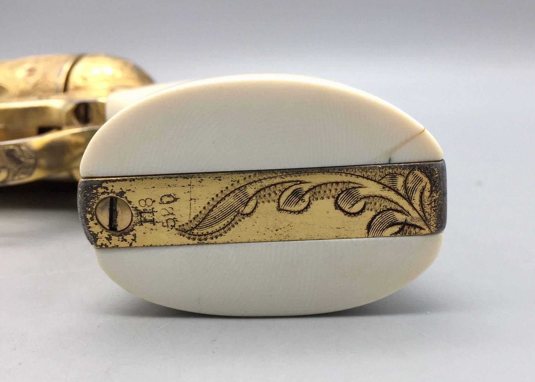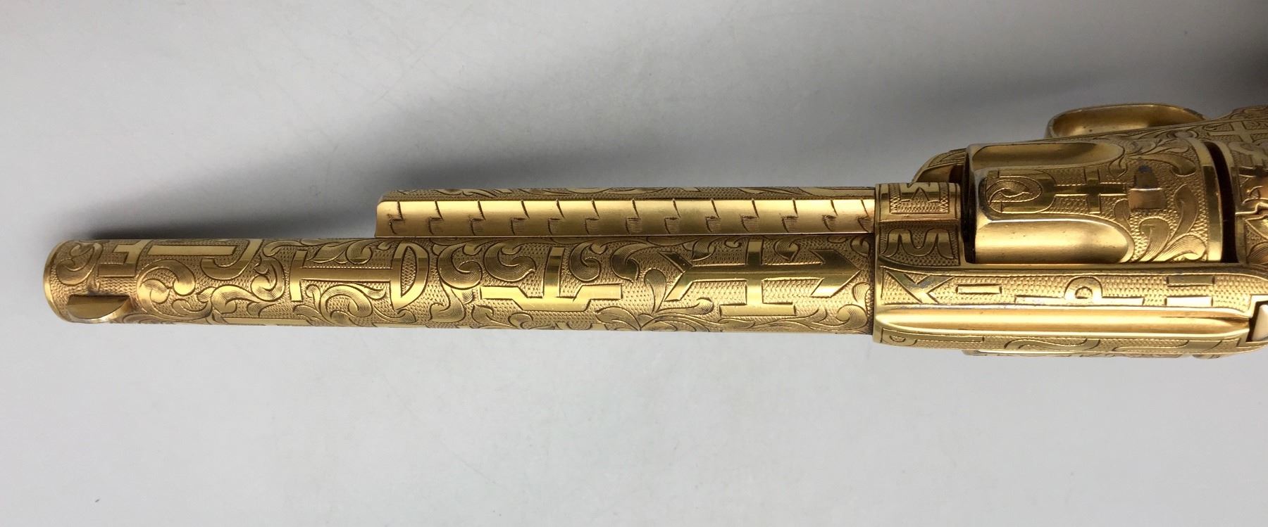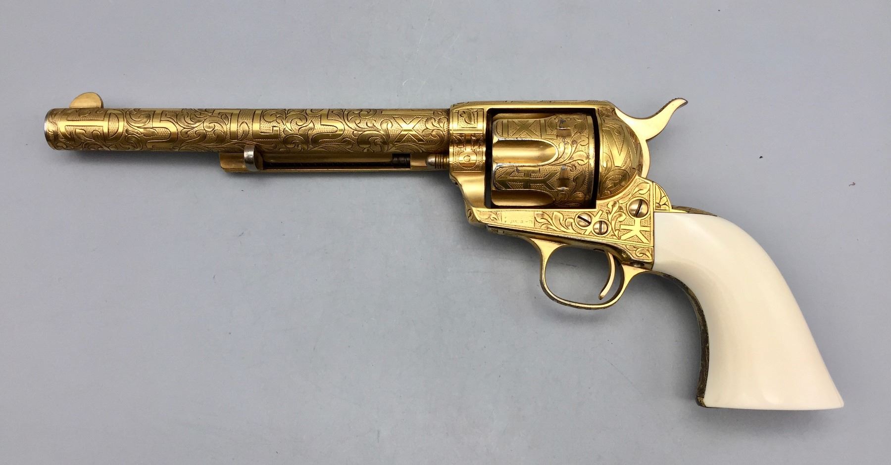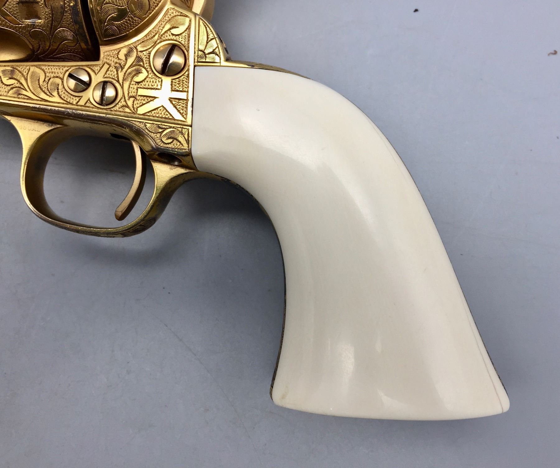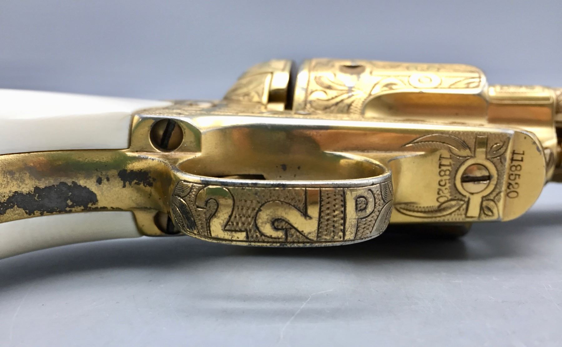 Description: For your bidding enjoyment is this Cole Agee Engraved Colt Single Action Revolver. This revolver features the signature Cole Agee, “Brands” engraving with fossilized ivory grips. This Colt is the exact same one that is published on pages 82 - 85 of the, Cole Agee, Texas Engraver book. It also comes with the book and a couple of magazines that speak about Cole Agee. Also include is the original letter published on P. 85 of the book which gives ownership information regarding this engraved Colt. Maker: Colt firearms co. and engraved by Cole Agee. Approx. Age: Pistol is 1886, engraving done sometime between 1920 and 1955. Size: 7” barrel. Condition: Pretty good for its age, some wear expected. Some of the gold plating is rubbing thin in places from people cycling it and other minor wear. Please look closely at the pictures - they are an important part of our description. Shipping: There will be a $10 handling / packaging fee for shipping this lot. The actual cost of postage will be added on top of that.