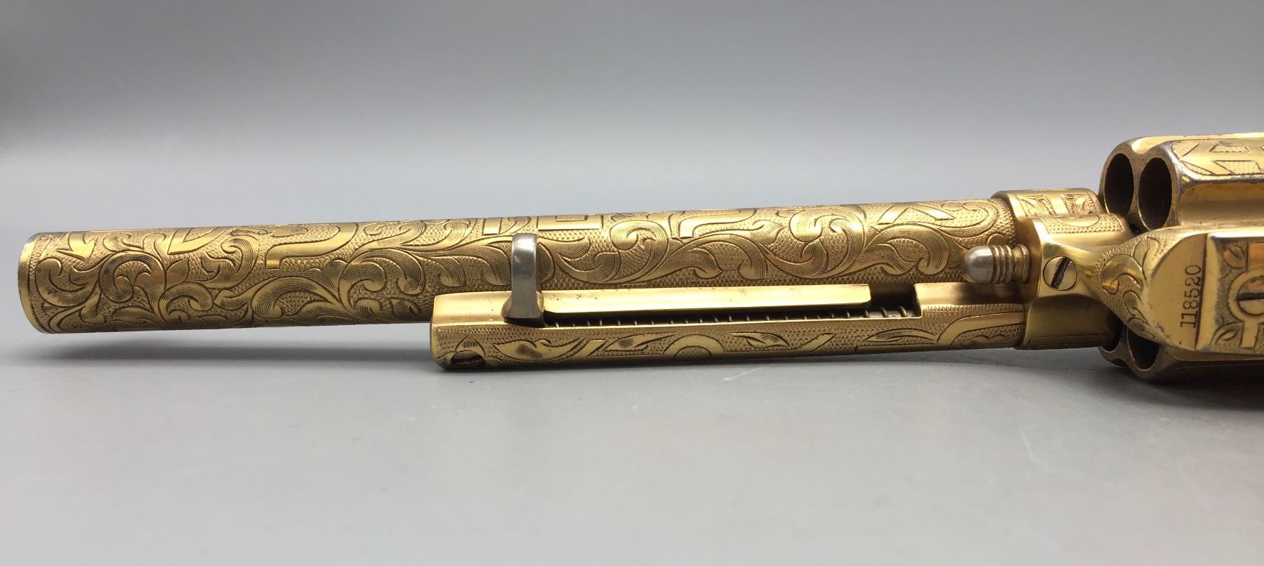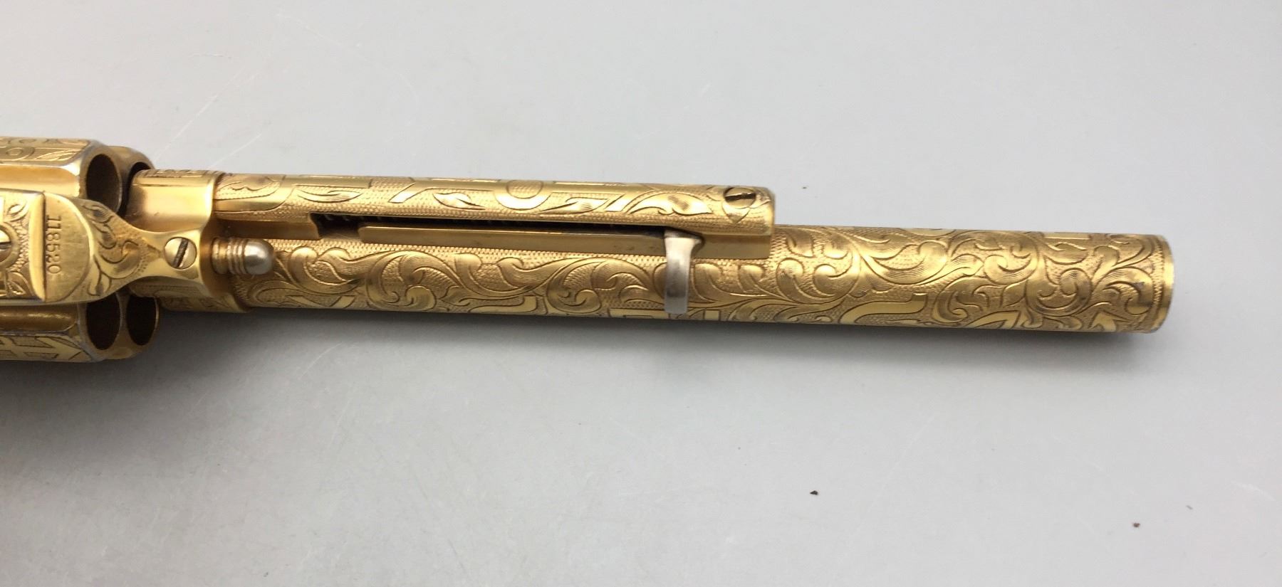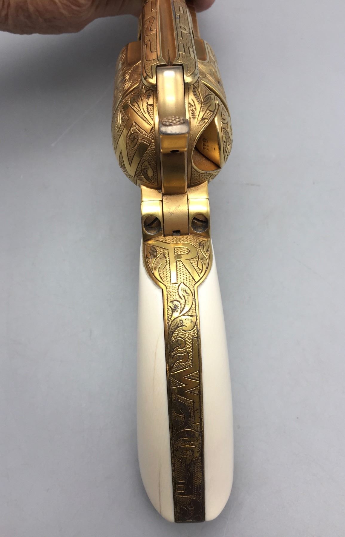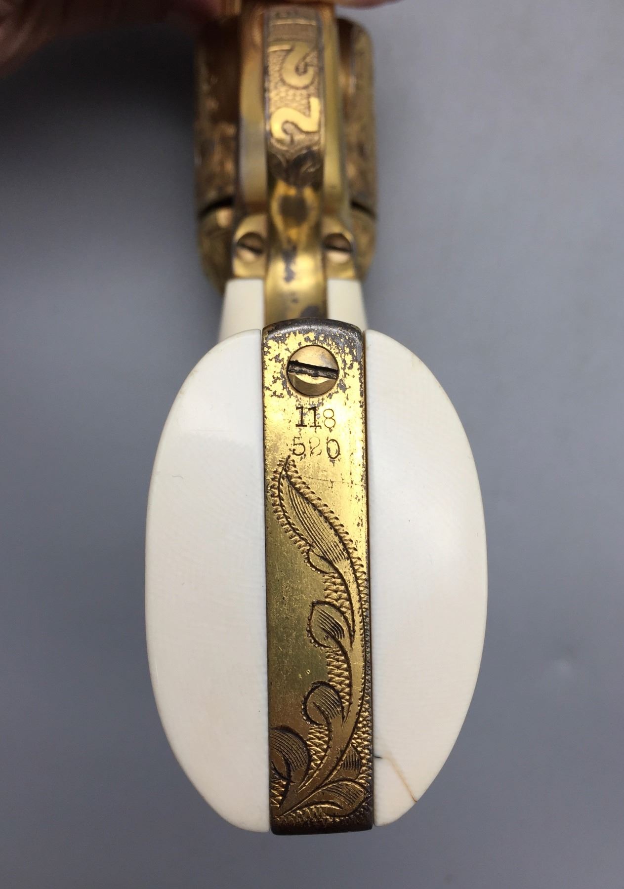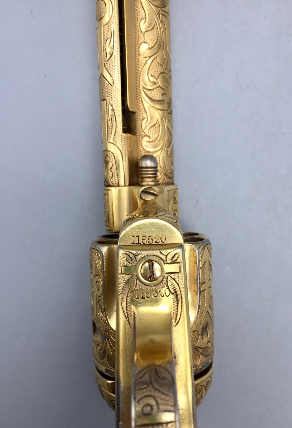 Description: For your bidding enjoyment is this Cole Agee Engraved Colt Single Action Revolver. This revolver features the signature Cole Agee, “Brands” engraving with fossilized ivory grips. This Colt is the exact same one that is published on pages 82 - 85 of the, Cole Agee, Texas Engraver book. It also comes with the book and a couple of magazines that speak about Cole Agee. Also include is the original letter published on P. 85 of the book which gives ownership information regarding this engraved Colt. Maker: Colt firearms co. and engraved by Cole Agee. Approx. Age: Pistol is 1886, engraving done sometime between 1920 and 1955. Size: 7” barrel. Condition: Pretty good for its age, some wear expected. Some of the gold plating is rubbing thin in places from people cycling it and other minor wear. Please look closely at the pictures - they are an important part of our description. Shipping: There will be a $10 handling / packaging fee for shipping this lot. The actual cost of postage will be added on top of that.