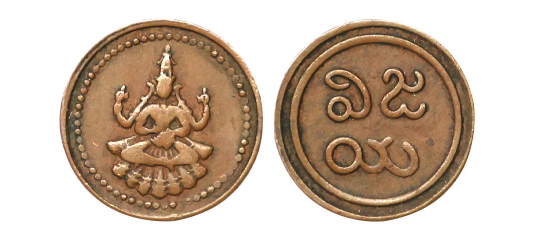 Puddukottai State, Anonymous Issue, Copper Amman Cash, 1.23 gms, Obv. seated goddess brihadamba facing, Rev. telugu legend ‘vi ja ya’, KM #6, very fine, scarce.