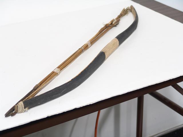 Early/Mid 1900s, Antique painted saguaro bow with 3 old hand forged iron tipped arrows. 32"