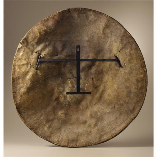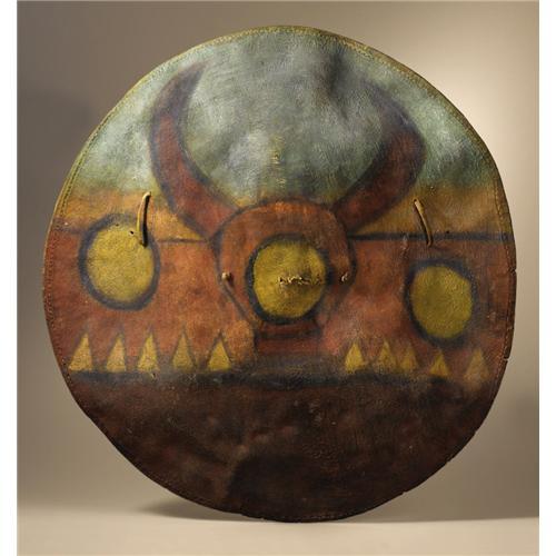 <B>Pueblo Buffalo Rawhide War Shield</B></I><BR>Circa 1800<BR>Diameter 23 in.<BR><BR>This early, slightly convex war shield is composed of two layers of buffalo rawhide, the perimeter finely and tightly stitched along the rim. A horned figure dominates the center of the shield. A series of yellow triangles emerge from the horizon line that marks the lower third of the shield. Three yellow spheres move across the center. The reverse is undecorated and vestiges of the carrying ties remain.<BR>The Pueblo people fought primarily on foot and used the shield as a true defensive device. Its effectiveness was enhanced by supernatural protection afforded by the painted symbols.<BR>This shield is stylistically similar to a number of documented shields collected at Jemez Pueblo in the early years of the 20th century. (See: Wright, Barton; <I>Pueblo Shields,</B></I> Northland Press, Flagstaff, Arizona, 1976, pp. 48-61.)<BR><BR>Provenance<BR>Christie's, Sale 1332, Lot 53, January 12, 2004.<BR><BR>
