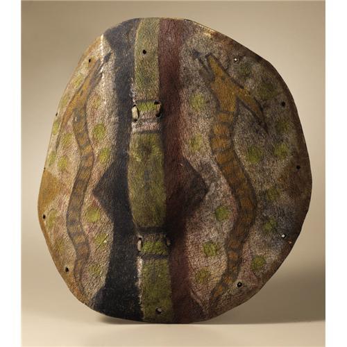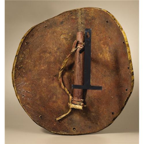 <B>Pueblo Buffalo Rawhide War Shield</B></I><BR>Circa 1800<BR>Diameter 14 in.<BR><BR>This thick buffalo rawhide shield is finely painted with a pair of avanyus (water serpents), a central vertical band in black, green, and red, and with small green circles spread over the white background. A short wood handle, usually associated with Pima shields, is tied to the reverse. (For similar examples in size and design see: Wright, Barton; <I>Pueblo Shields,</B></I> Northland Press, Flagstaff, Arizona, 1976, figure 17, p. 30 and figure 27, p. 40.)<BR><BR>Provenance<BR>From the estate of Paul Peralta-Ramos, founder of the Millicent Rogers Museum in Taos, New Mexico. <BR>Sotheby's, Lot 146, June 24, 2004.<BR><BR>