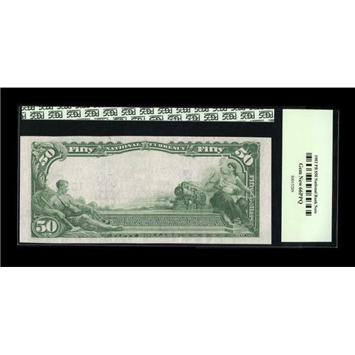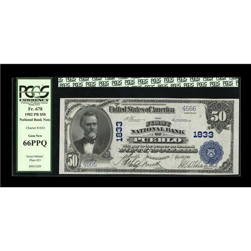 <B>Pueblo, CO</B></I> - $50 1902 Plain Back Fr. 678 <B>The First NB</B></I> Ch. # 1833<BR>A note of tremendous quality and importance, with this one of just three Series 1902 $50 Colorado Blue Seals grading uncirculated from all banks (save for the notes on one uncut sheet) in the state combined. It's certainly likely this is the finest of that very small group, as we could scarcely conceive of another example possessing the beauty of this specimen. Pen signed, with pure white paper and great colors, it is encapsulated in a PCGS <B>Gem New 66 PPQ</B></I> holder, a judgment which seems conservative considering the appearance of this specimen. Expect to see some serious bidding before the hammer falls on this lot tonight.