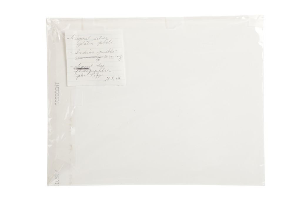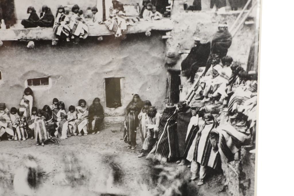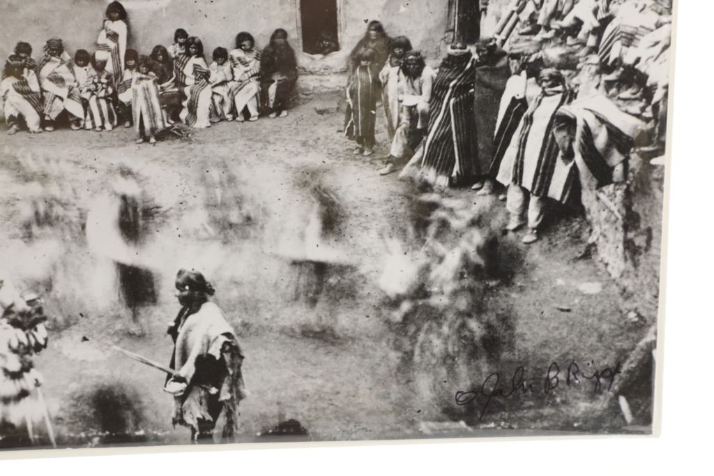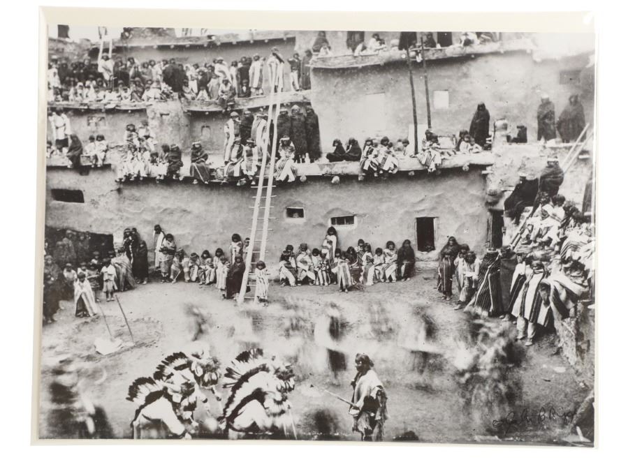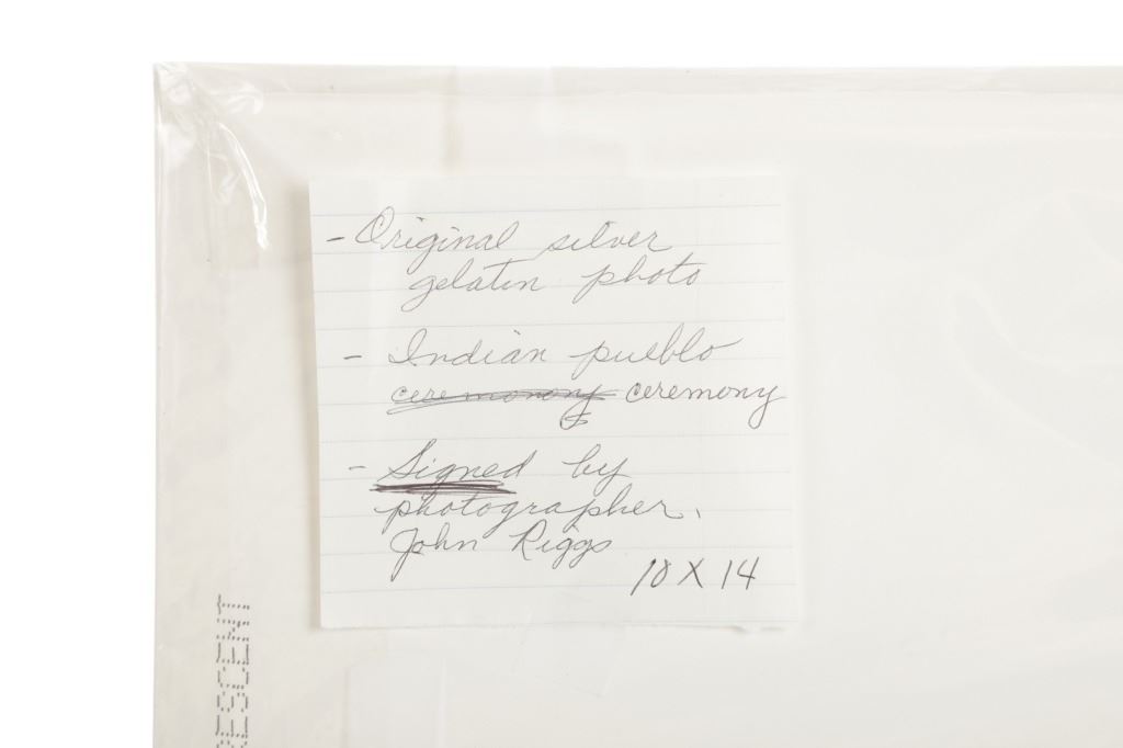 This lot has a vintage original signed gelatin silver photograph of a Native American Pueblo Ceremony, by John B. Riggs circa 1890s. The ceremony appears to be the Transfer of Canes in which the transfer of commission and authority to new tribal leaders is acknowledged. The ceremony historically has occured on New Year's Day or soon thereafter of every year. the canes symbolize the sovereignty of the Pueblo people and the authority of their tribal governments. The nineteen Pueblos are the only tribal nations in the United States to have such a recognition.