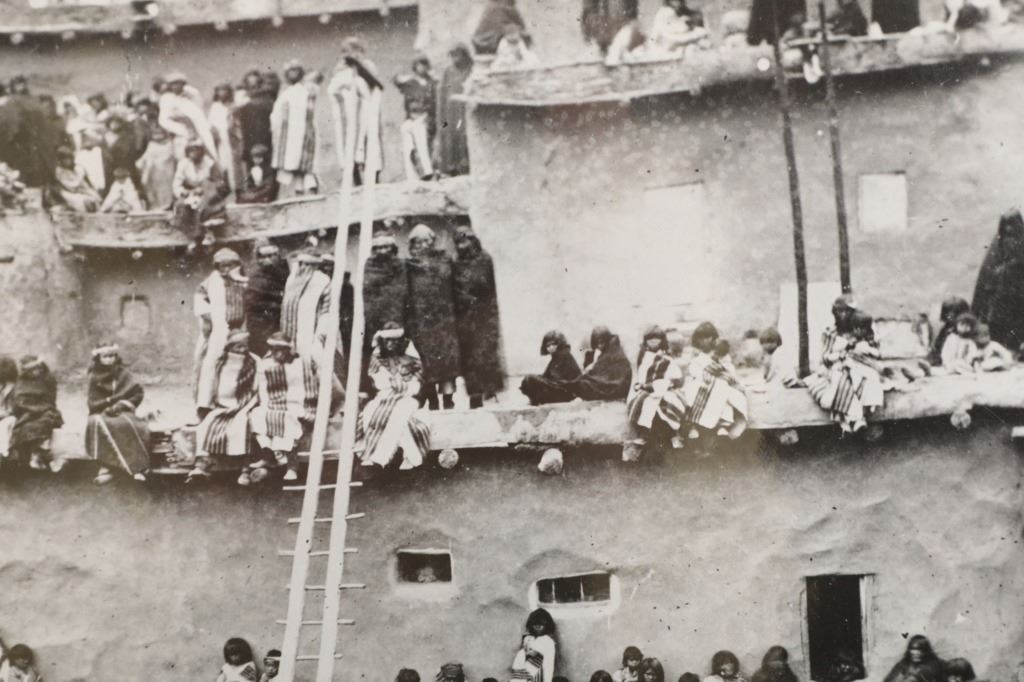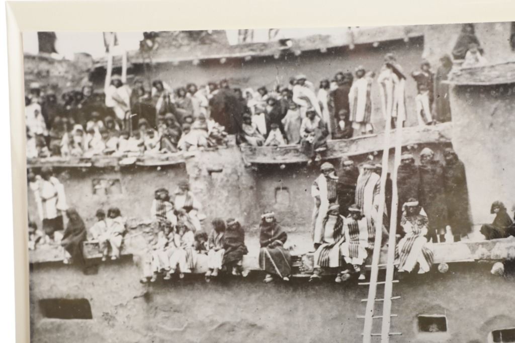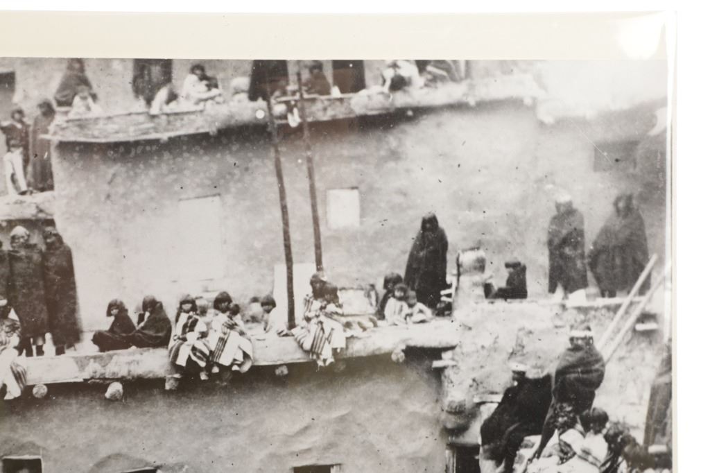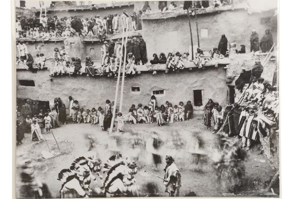 This lot has a vintage original signed gelatin silver photograph of a Native American Pueblo Ceremony, by John B. Riggs circa 1890s. The ceremony appears to be the Transfer of Canes in which the transfer of commission and authority to new tribal leaders is acknowledged. The ceremony historically has occured on New Year's Day or soon thereafter of every year. the canes symbolize the sovereignty of the Pueblo people and the authority of their tribal governments. The nineteen Pueblos are the only tribal nations in the United States to have such a recognition.