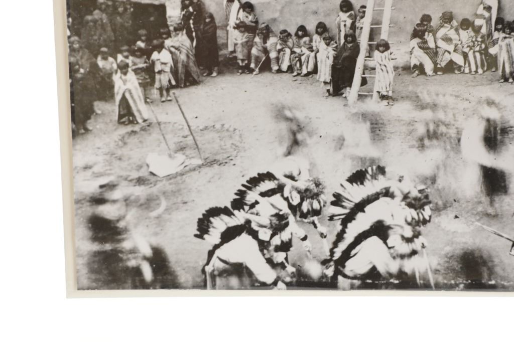 The photograph shows the majority of the people (except the dancing chiefs wearing feathered war bonnets) wrapped in wool trading blankets which would be consistent with weather in January in Northeast Arizona and Northwest New Mexico. The photograph is in good condition, the photographer's signature is on the bottom right-hand corner, no marring noted to the photo. Measures 13.75"L x 10.25"W