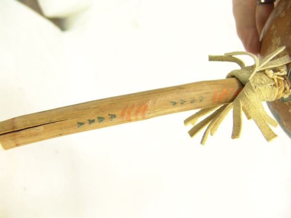 Wonderful larger (two-sided) carved and painted gord rattle with eagle figure on one side, flower on the other, and with great patina. Very good condition.,Ca. 1940s,14"