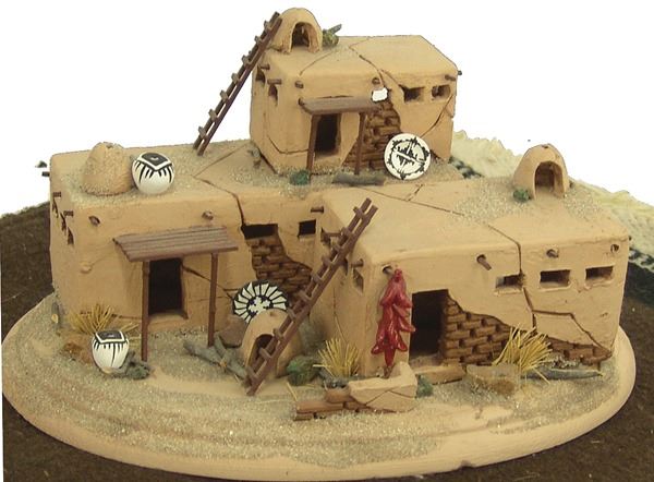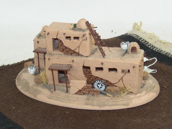 Hand crafted signed original scene of several Pueblo structures with pottery ladders, a ristra, and ovens. Very good condition. Signed "Leanette Brockelsby - 1988.,Ca. 1988,9-1/2" x 7-1/2" x 5"