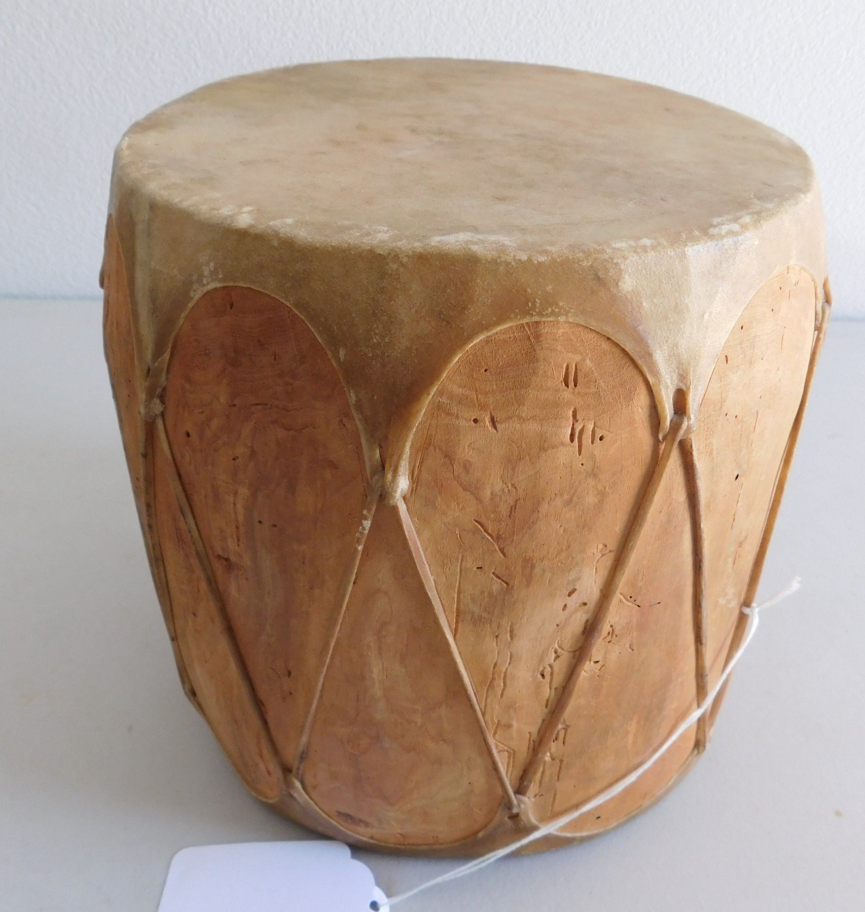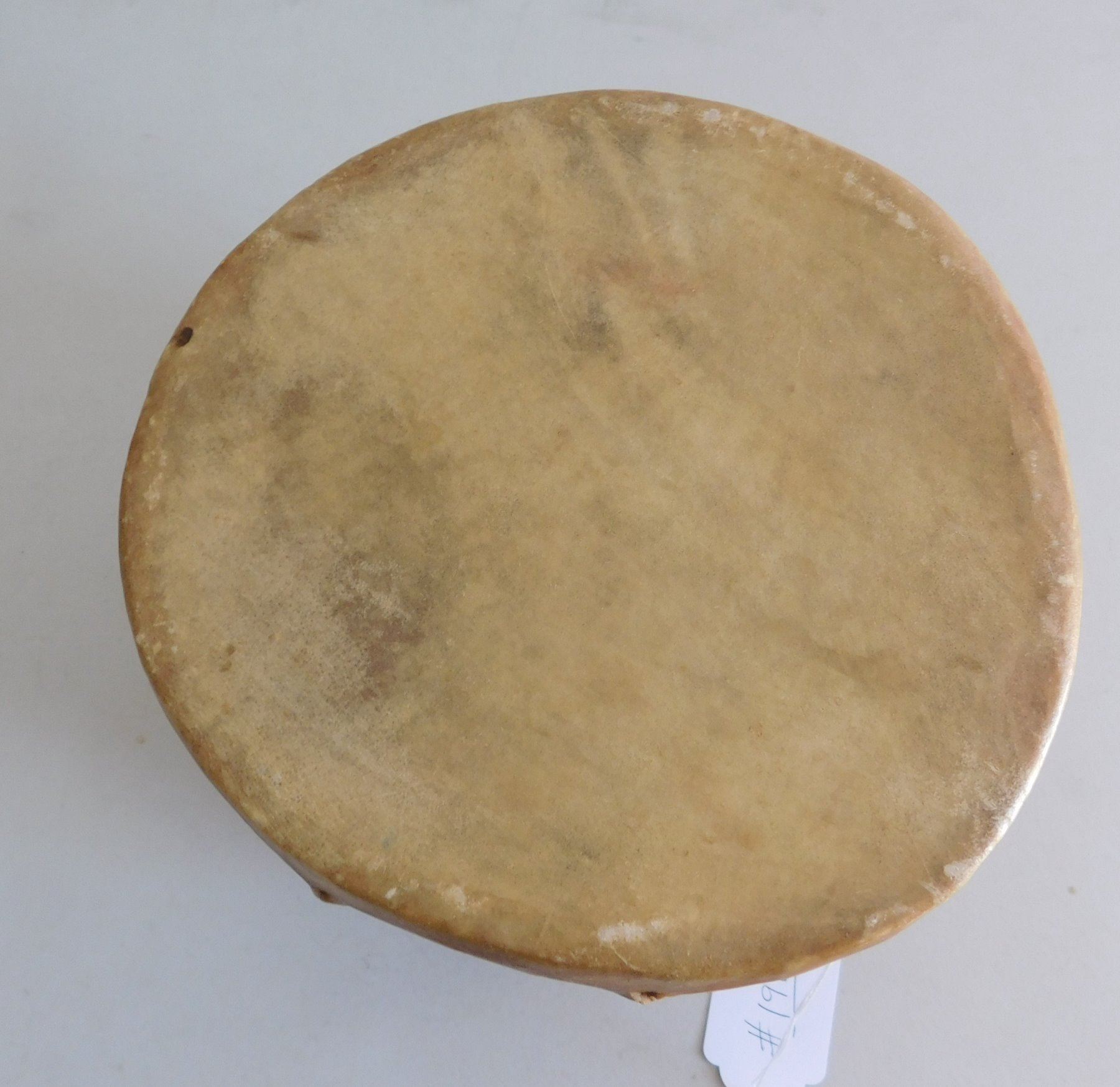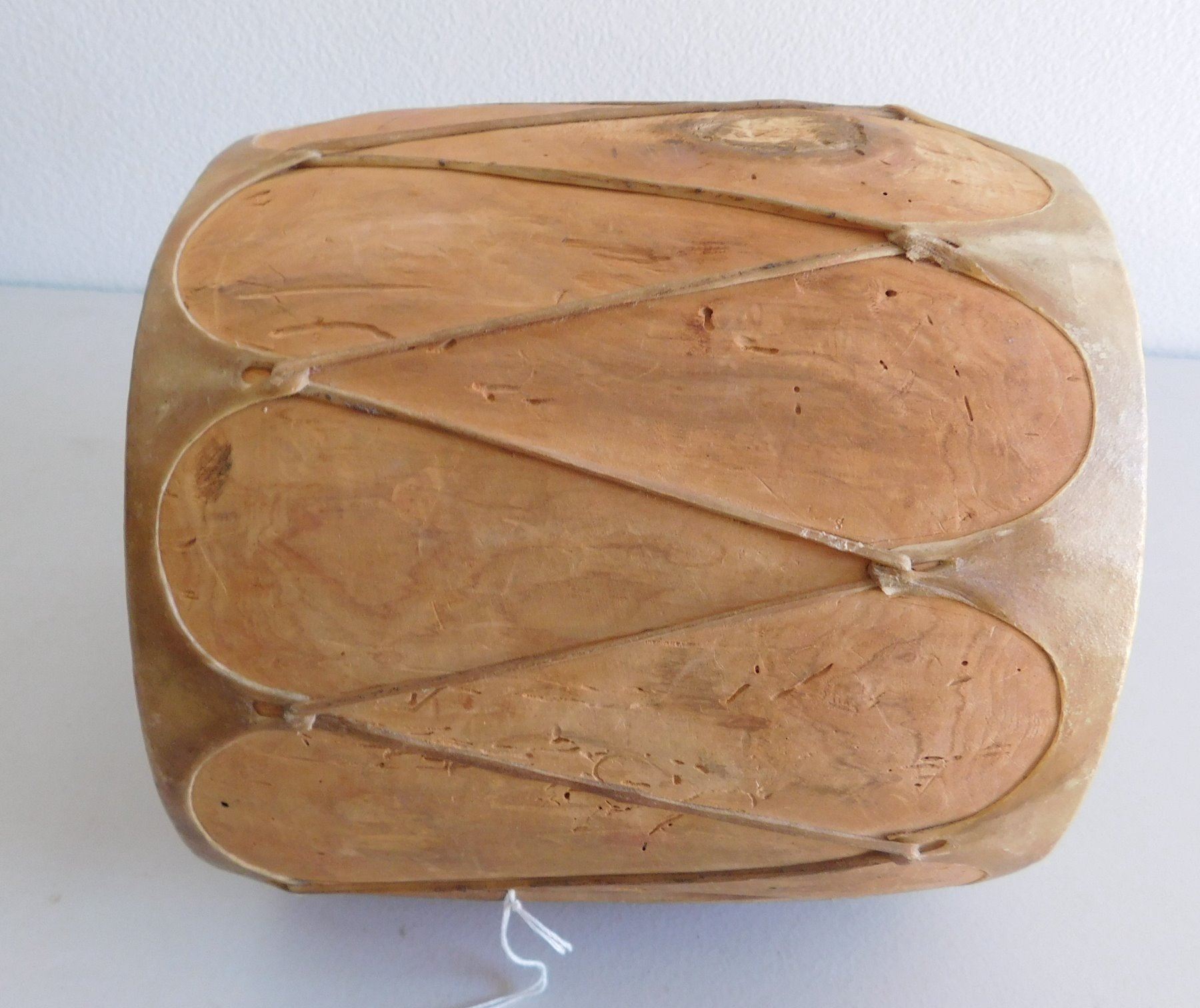 Pueblo Drum, circa 1940s. Made of cottonwood and rawhide, the item measures 8.5" x 8". New Mexico. Nice sound. Condition: Good, some wear, see images. Shipping: $30.00 w/insurance and signature, due to size.