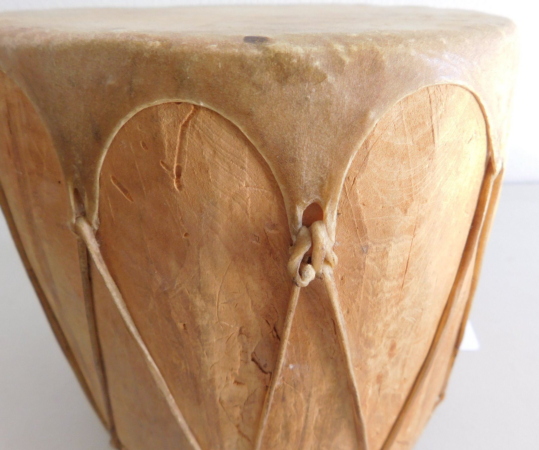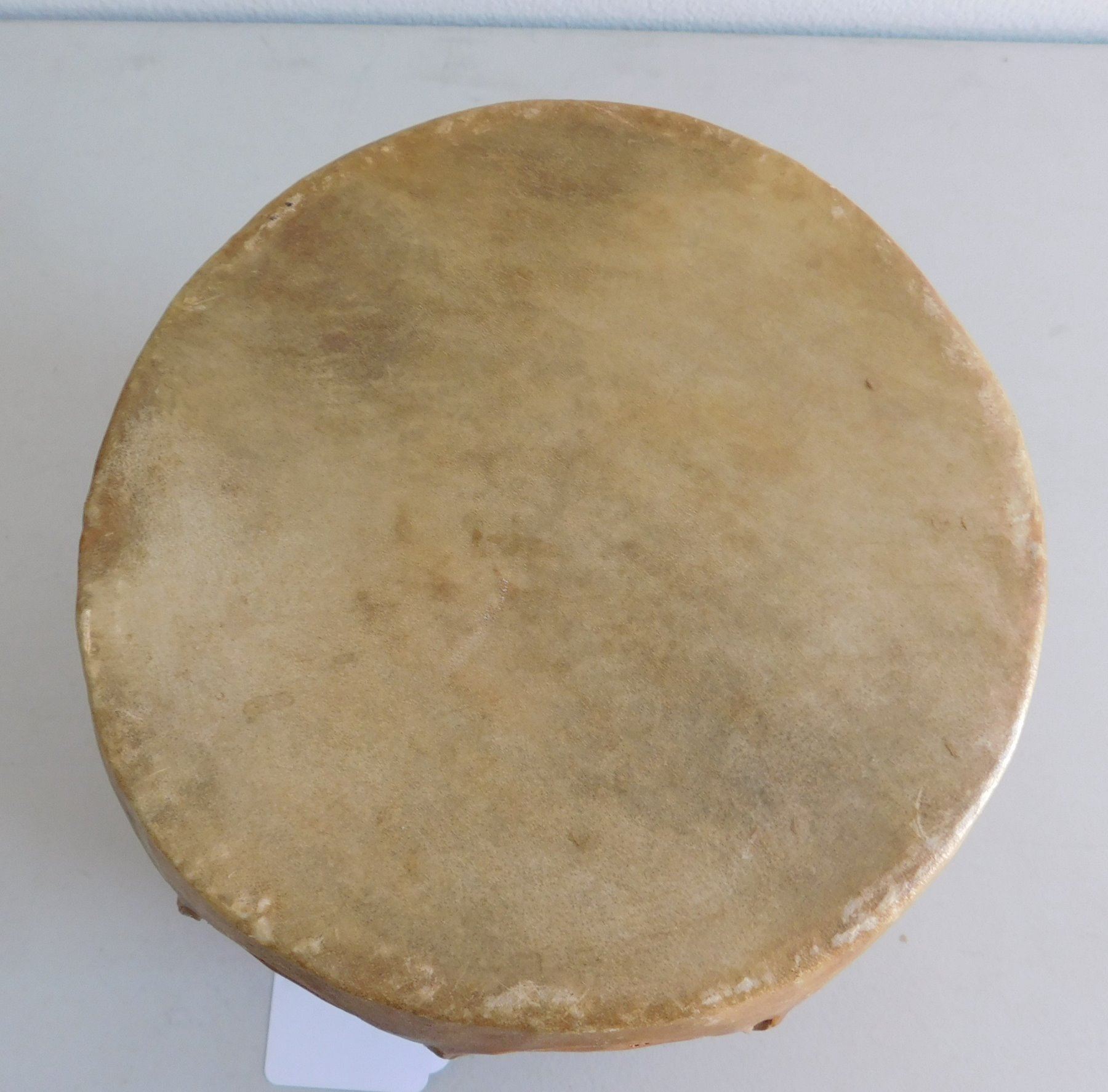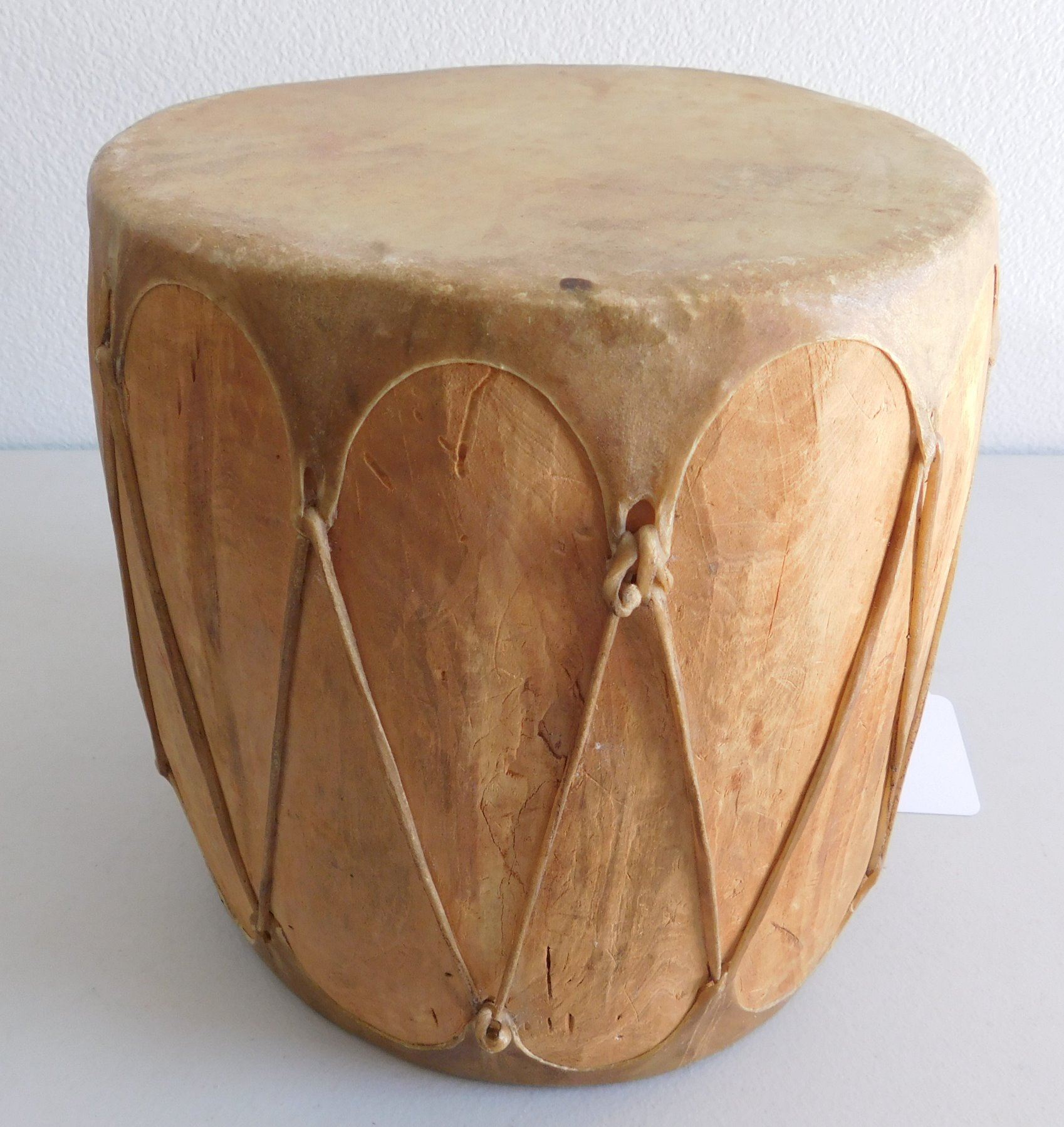 Pueblo Drum, circa 1940s. Made of cottonwood and rawhide, the item measures 8.5" x 8". New Mexico. Nice sound. Condition: Good, some wear, see images. Shipping: $30.00 w/insurance and signature, due to size.