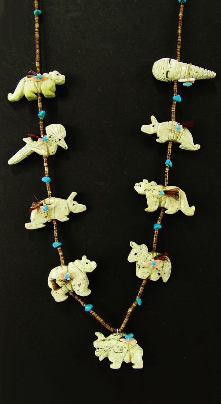 Late 1900s, Beautiful hand carved stone fetish necklace with many different animals, each with its "offering" on its back. Very good condition. 28" long