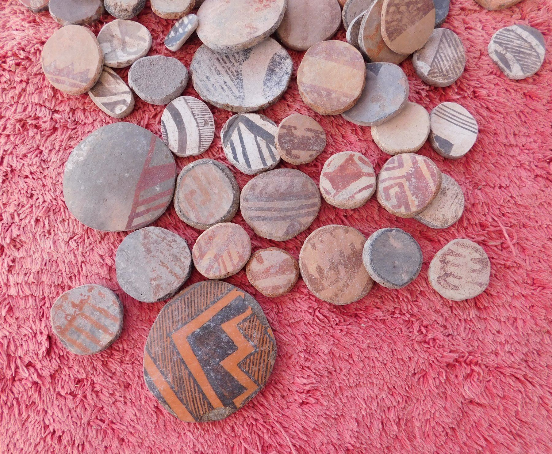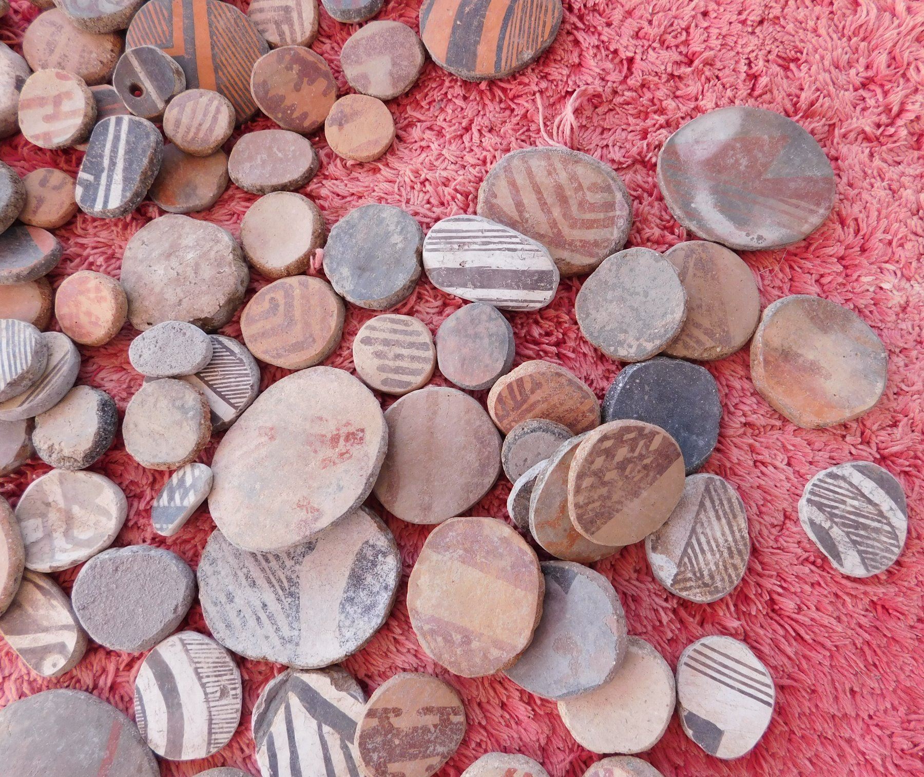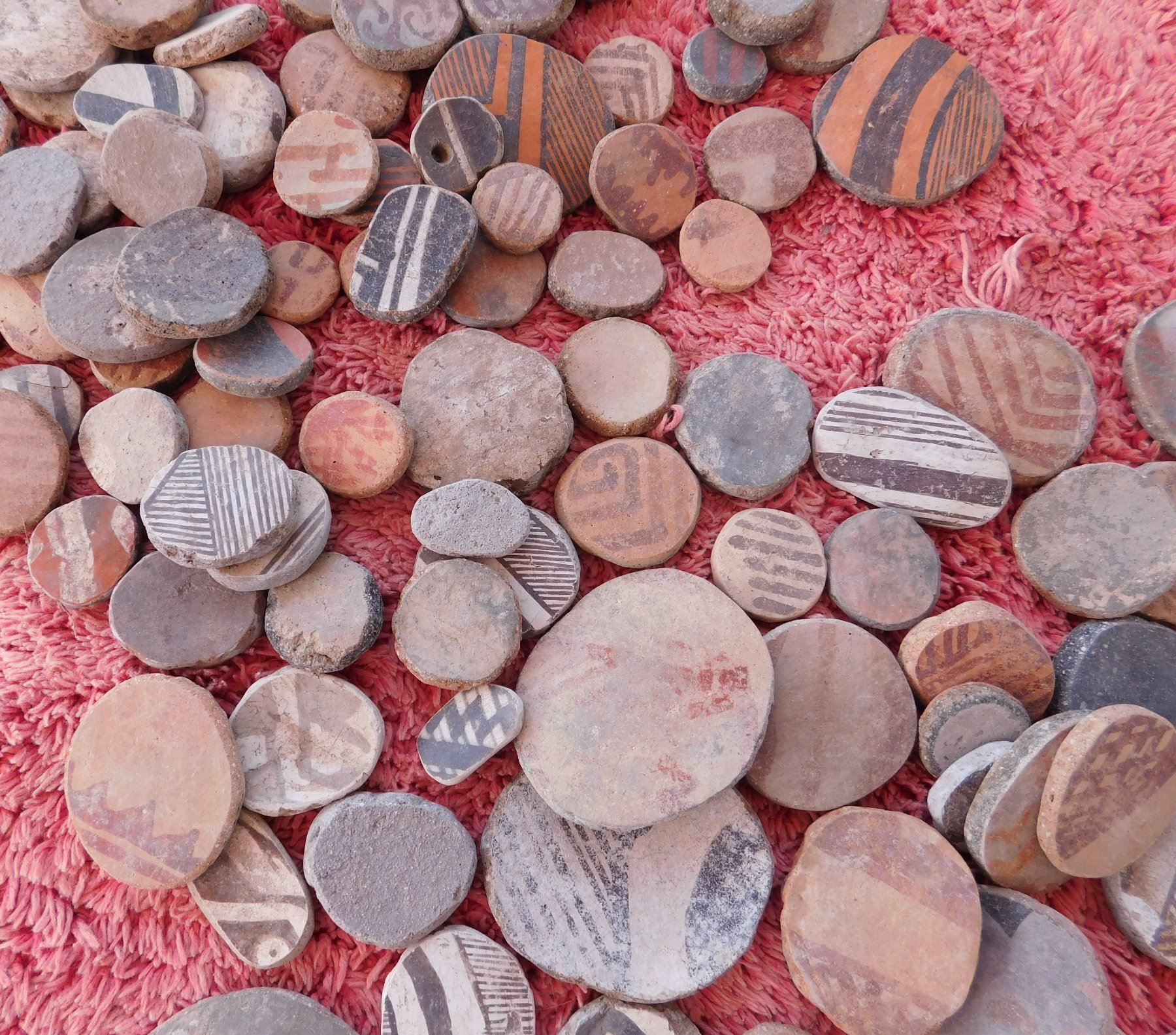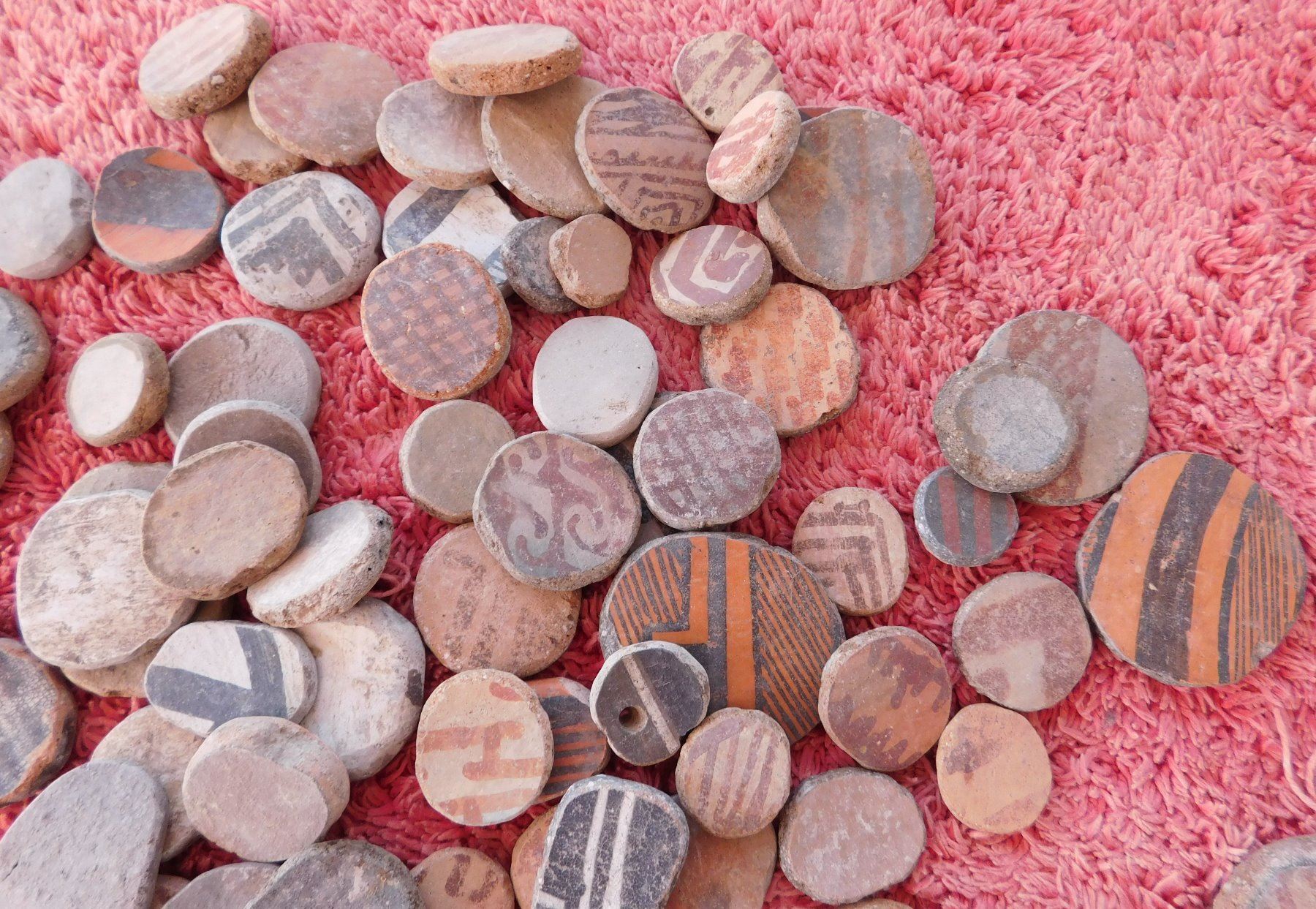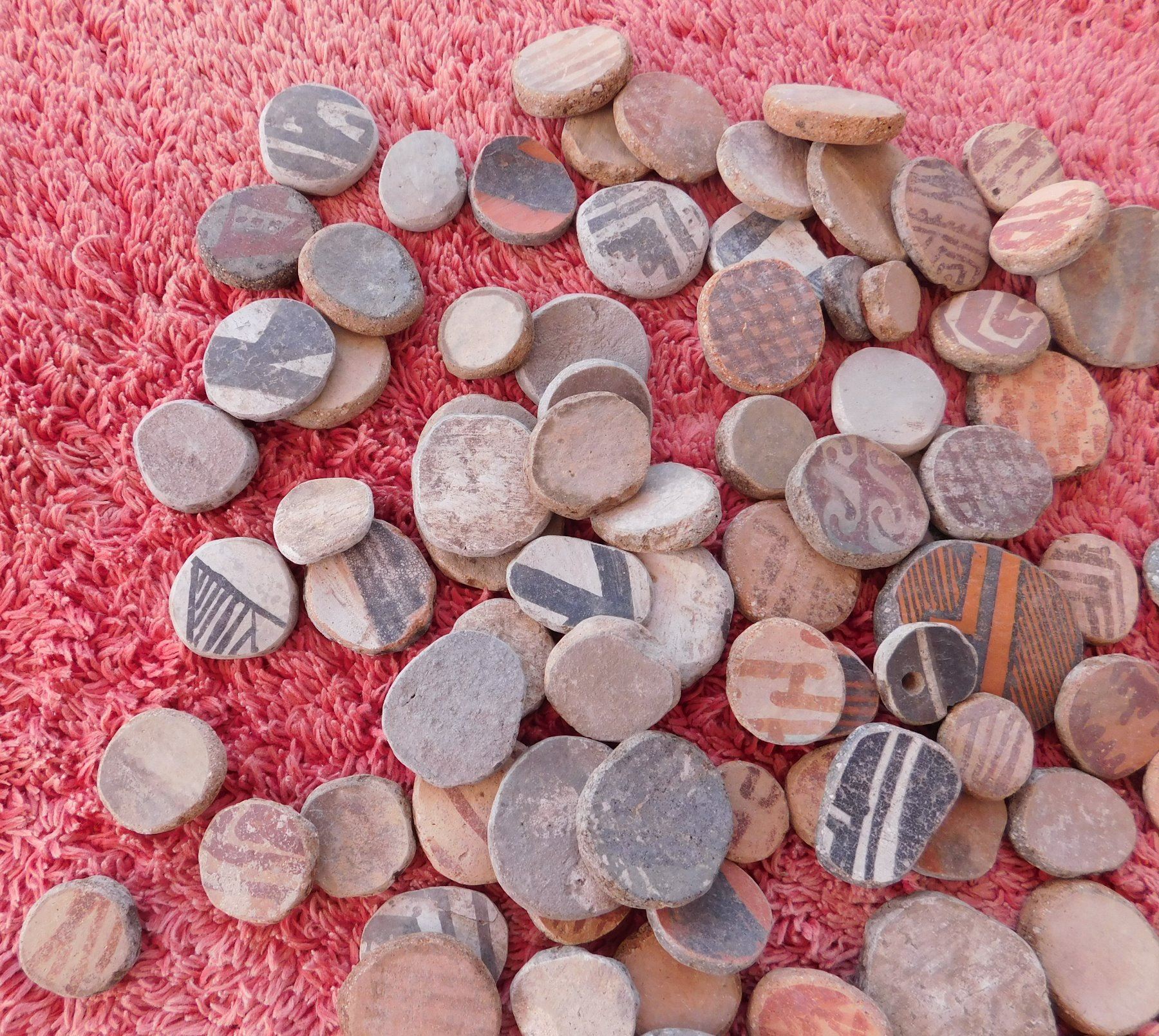 Pueblo Game Pieces Collection, pre-historic items. Made of clay and paint and stone, the items measure from 0.5" to 2.75". 4 corners area of the Southwest USA. Over 140 game discs, 18 points or blades, plus 1 small bead and 1 quartz crystal. From an old, 1960s California collection. Condition: As found, see images. Shipping: $22.50 w/insurance and signature.