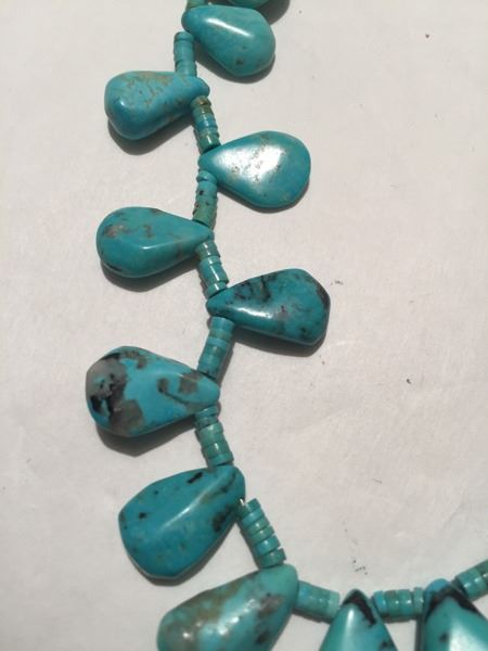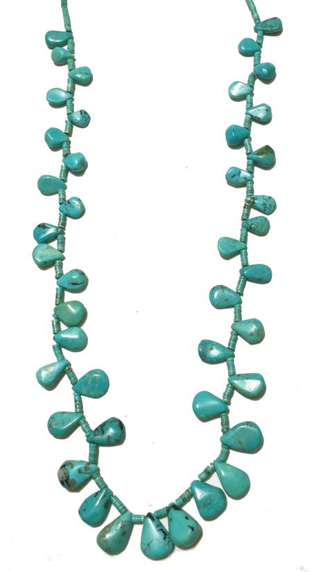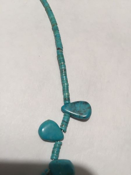 Late 1900s, Beautiful all turquoise necklace with turquoise tabs on turquoise heshi. 27"