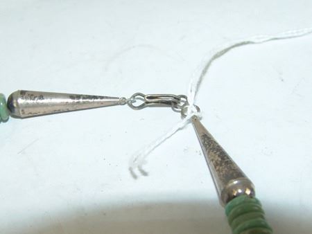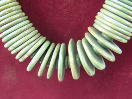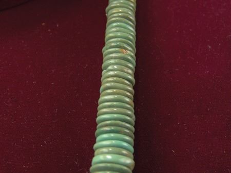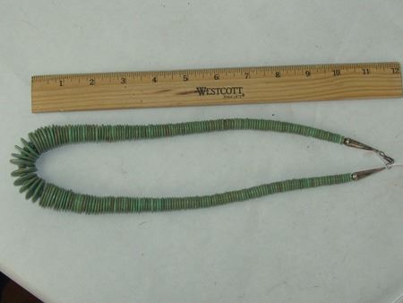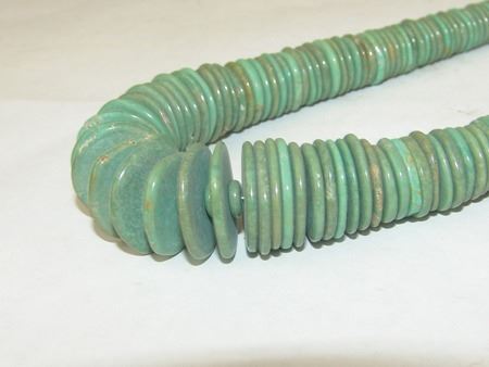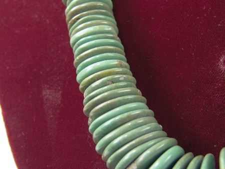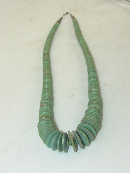 Ca. 1980s, Very fine graduated green turquoise necklace made with hand cut and shaded thin graduated disc beads. Excellent condition. 25" long