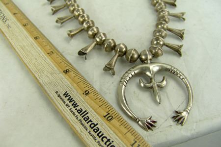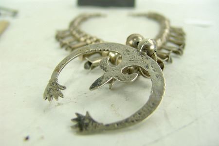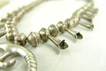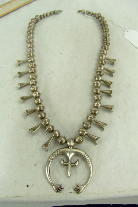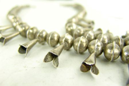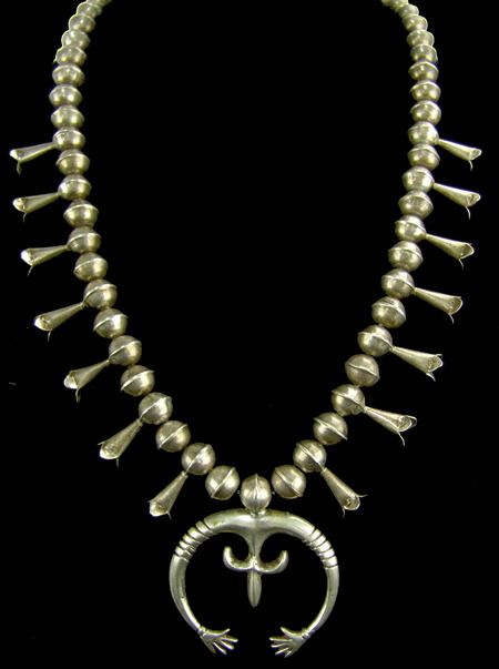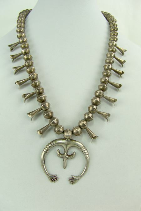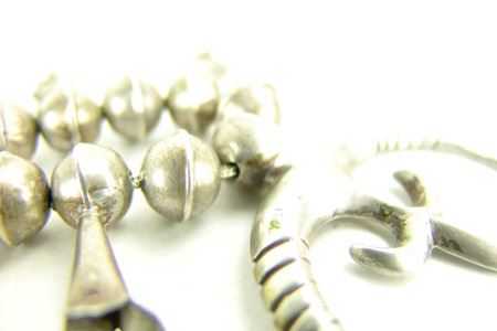 Mid 1900s, Vintage hand wrought all-silver stoneless squash with sandcast "friendship hands" naja and bench made pinched beads. Very good condition. 23"