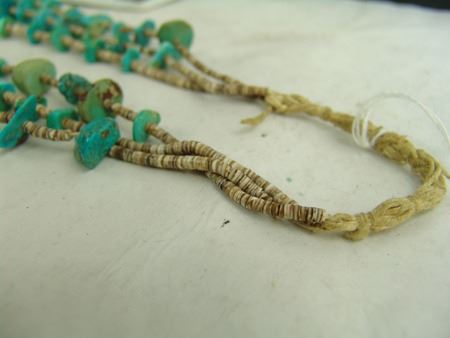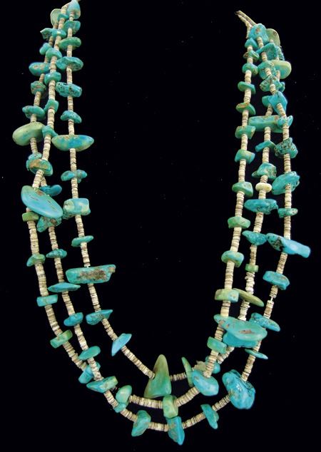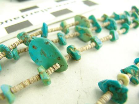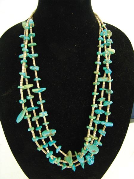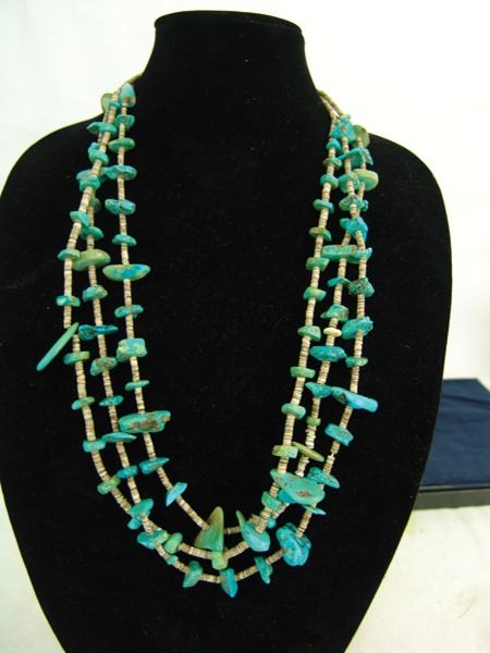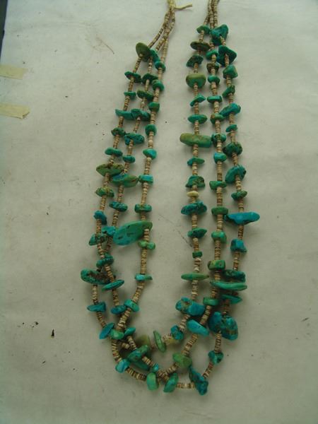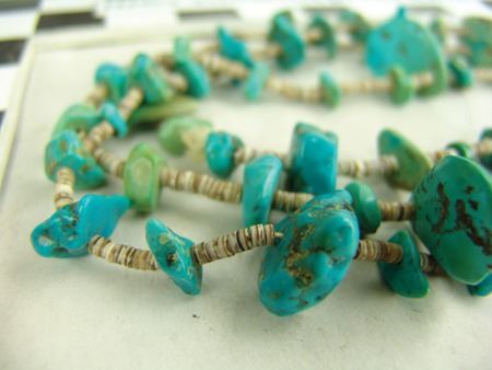 Ca. 1970s, Vintage three-strand graduated turquoise nugget necklace on fine shell heshi. Very good condition, nice patina. 30"