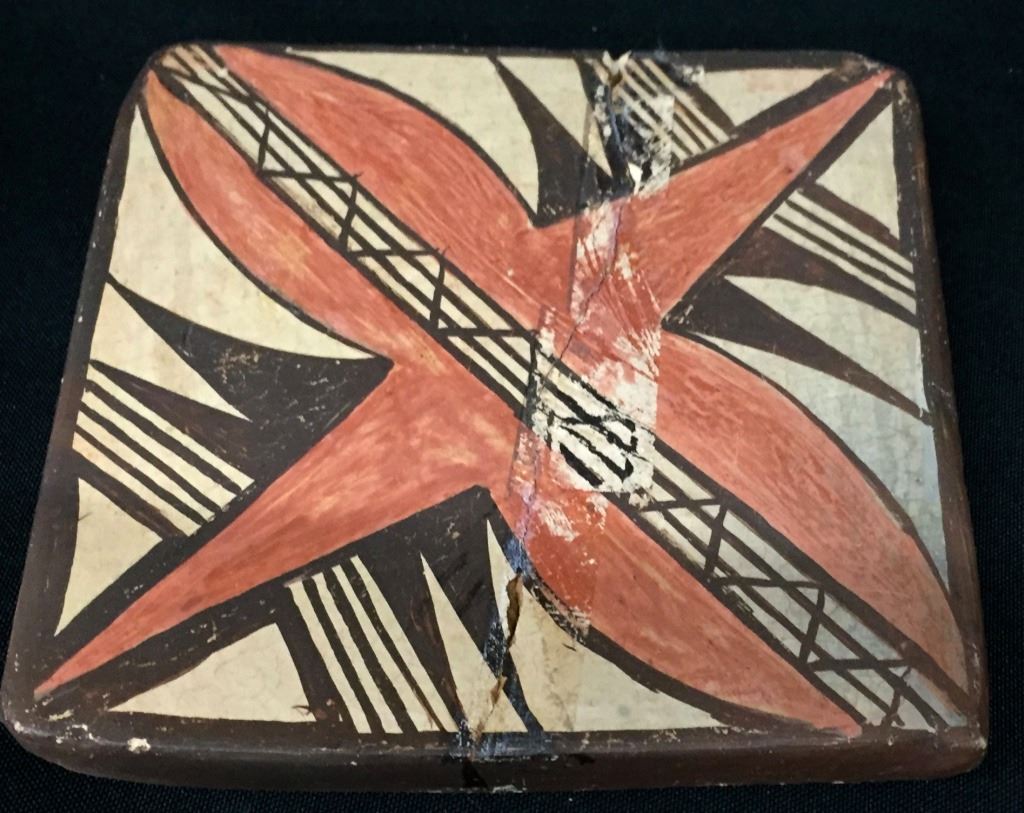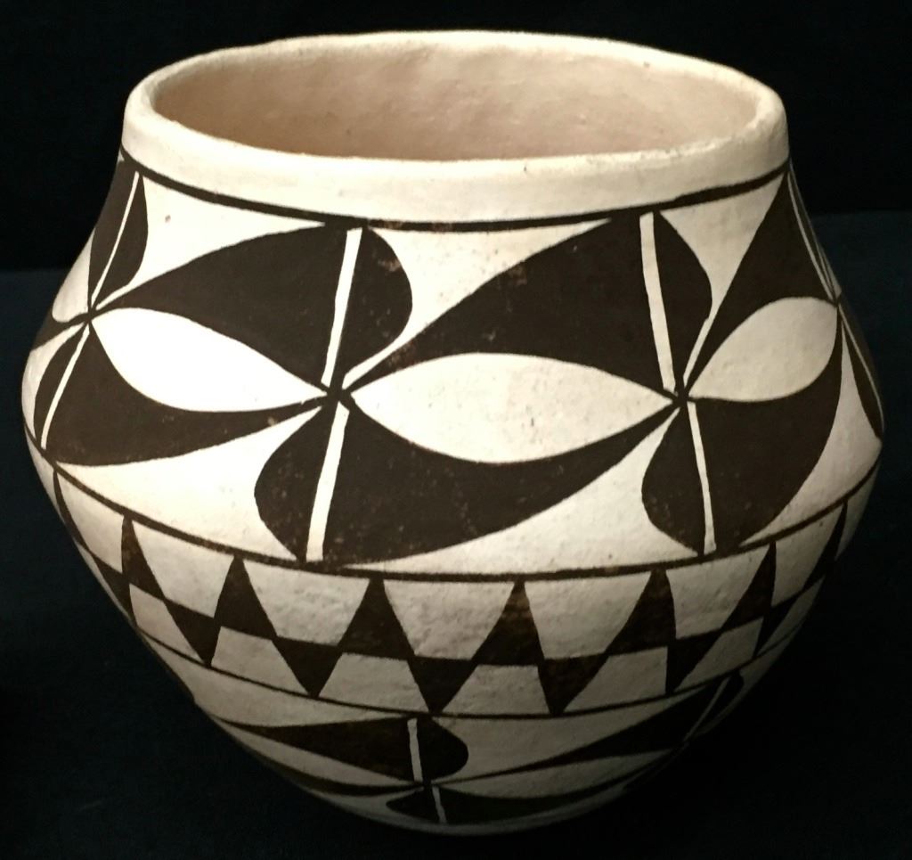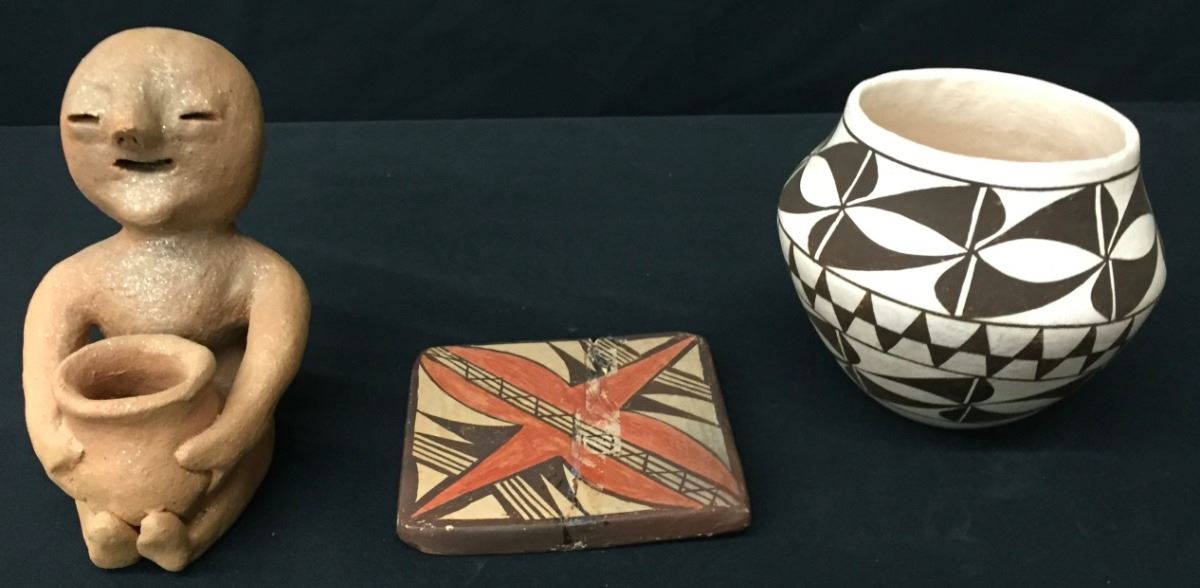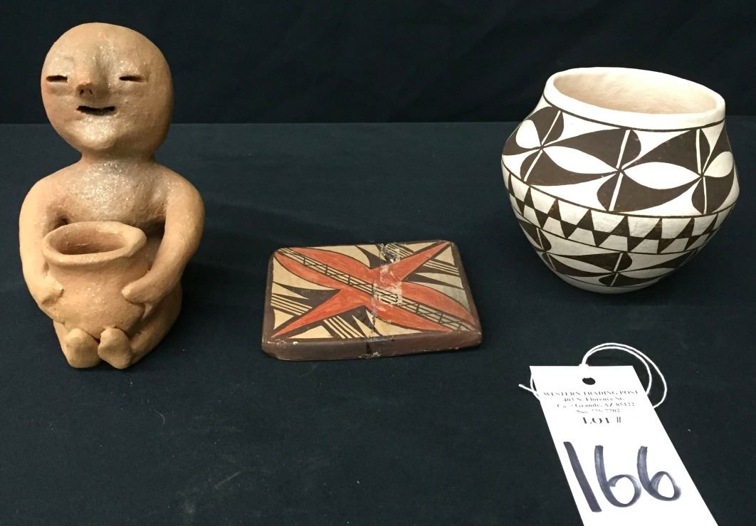 There is an Acoma pot (signed) which measures 4.5” high, a Tesuque Rain God pot (signed) which measures 6” high and a Zia tile which measures 4.5” across. Please note, the tile has been cracked. Please look closely at the pics as they are an important part of our description. Shipping: There will be a $7 handling / packaging fee for shipping this lot. The actual cost of postage will be added on top of that.