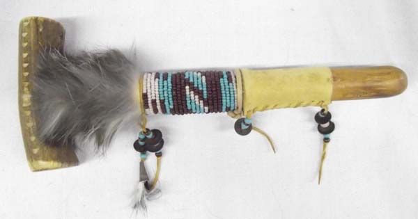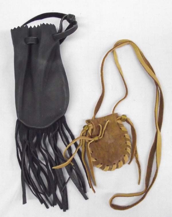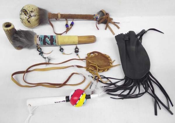 Native American Pueblo Rattles, Pipe, & Leather Pouches, #1 Painted leather rattle (lizard), with rabbit fur, bead, and leather accents, handle is covered in suede and there is fringe at the very end of the handle, #2 Antler pipe on wooden stem with leather, bead, and rabbit fur accents, antler is also etched, #3 Hopi Dance Rattle by Kminva, brightly painted in turquoise, yellow, red, white, and black, with feather accent on top, #4 black leather fringed pouch, #5 small brown leather pouch with 18'' end to end leather strap and amber colored accent beads, largest rattle is 11''L x 3''W and largest pouch is 4.5''L x 3''W
