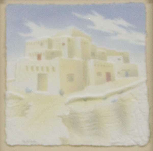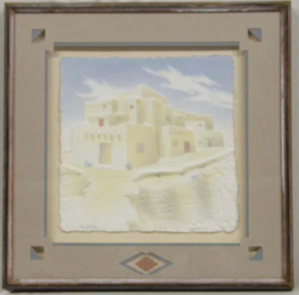 Pueblo Shadow Box Painting By Wess. Framed in a wood frame, double matted, under glass. Visual measures approx. 13'' x 13''. Buyers Pay Actual Shipping and Handling Charges(see terms and conditions for more information).
