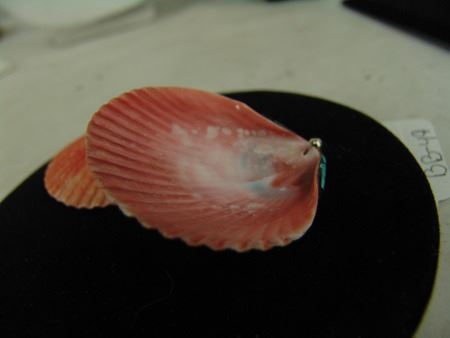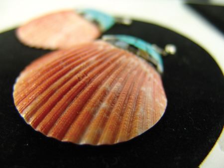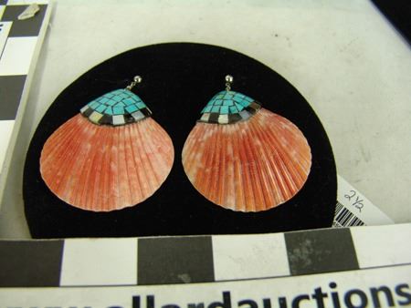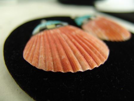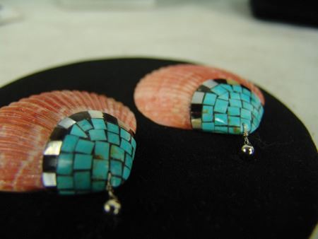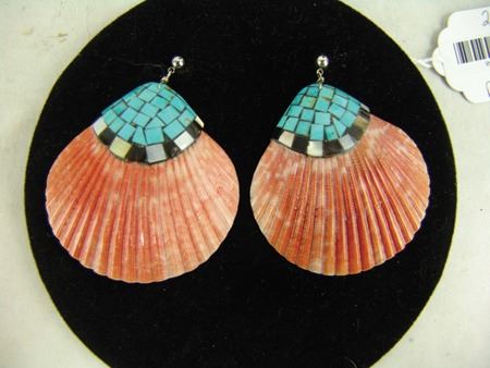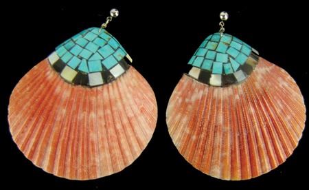 Ca. 1980s, Pair of pink fan shells with traditional mosaic overlays of turquoise, jet, and mother of pearl. Very good condition. 2-1/2"