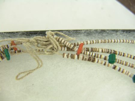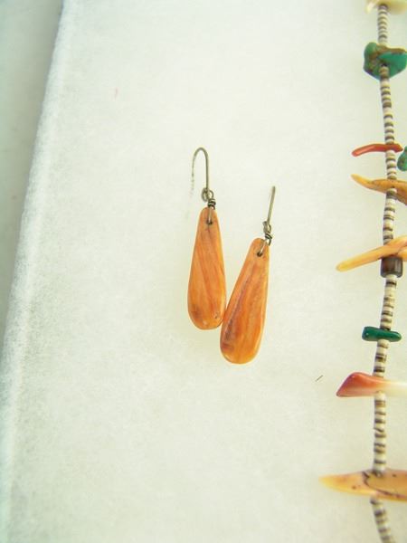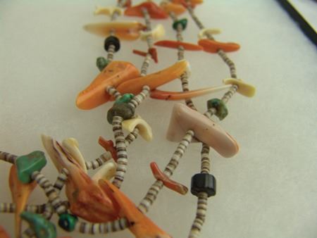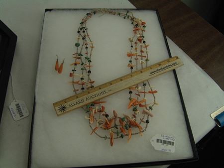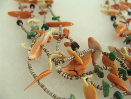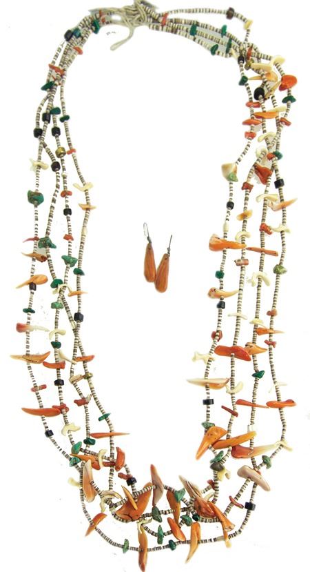 Ca. 1980s, Colorful, longer, four-strand, fine heshi necklace loaded with lightly carved spondulus shell beads, turquoise nuggets, and other shell beads, plus a pair of matching spondulus earrings. Very good condition. 32", earrings 1"