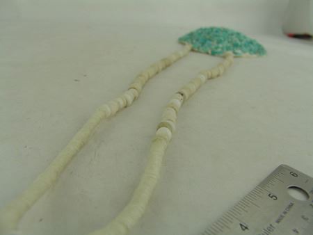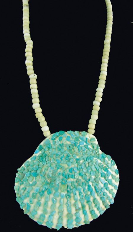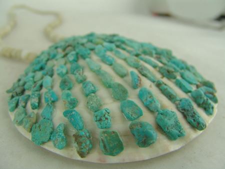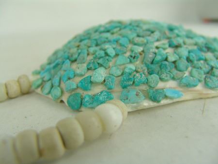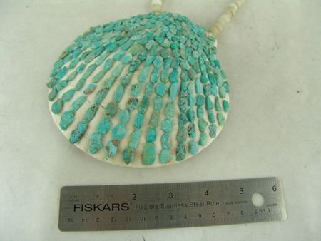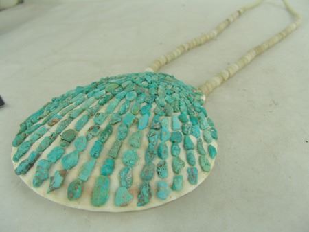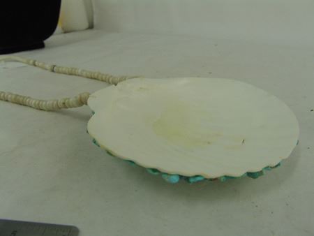 Late 1900s, Huge white shell pendant adorned with rows and rows of small applied turquoise nuggets, on a strand of old Mission style tradebeads. 27" plus shell