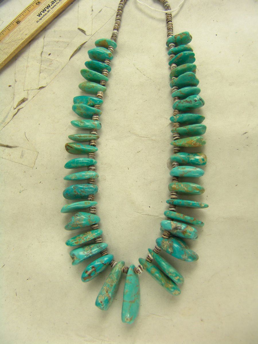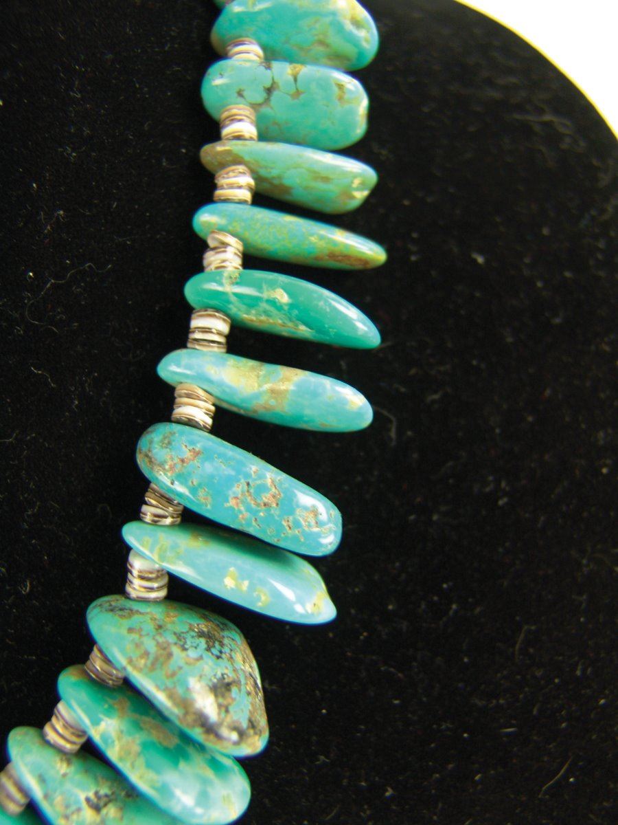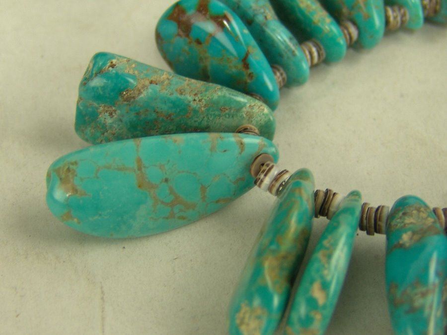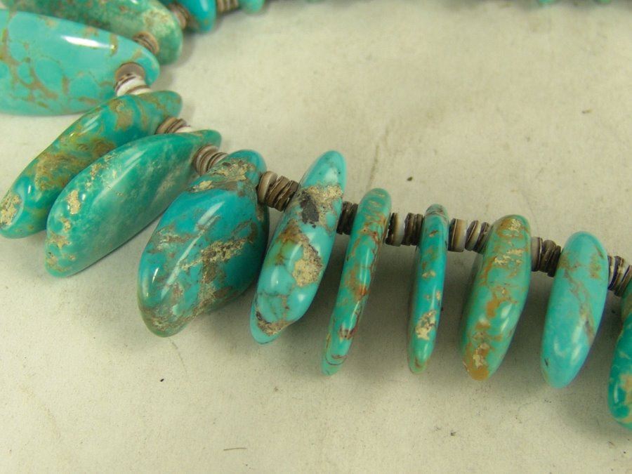 Wonderful shorter length necklace made with 4mm shell Heshi and loaded with polished, graduated pendant-drilled matching green Royston turquoise stones. Very good condition, nice patina.,Ca. 1970s,18"