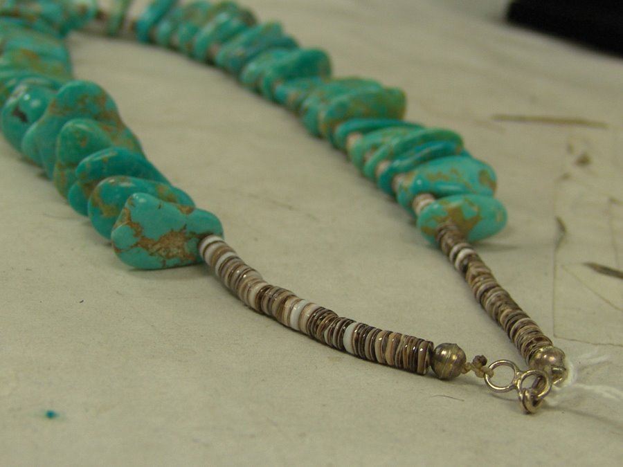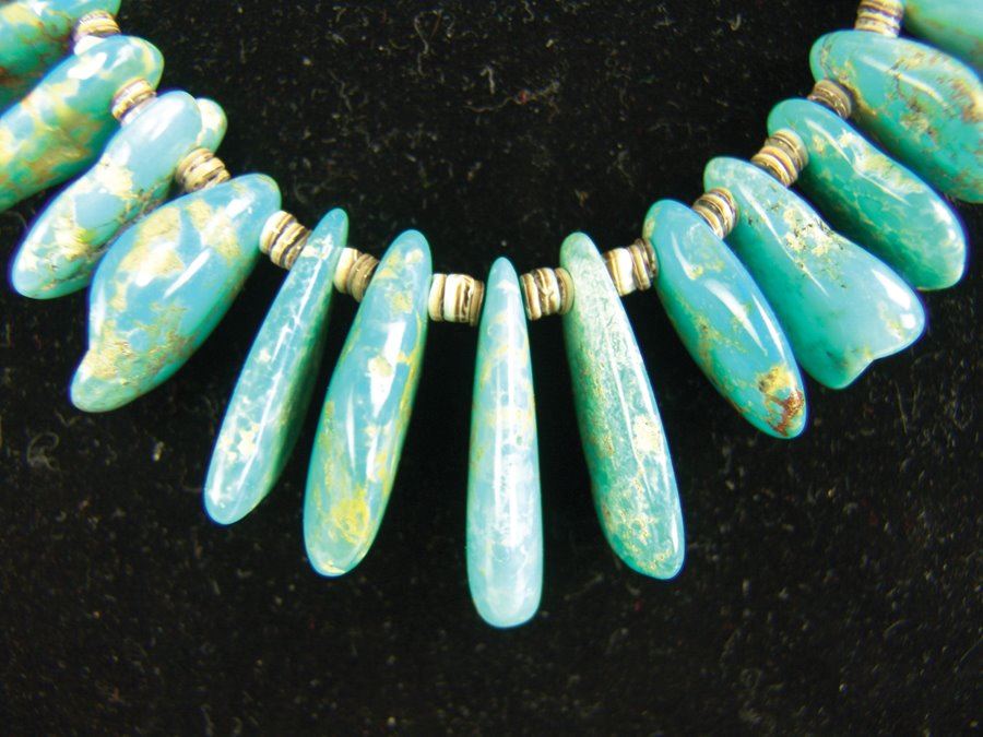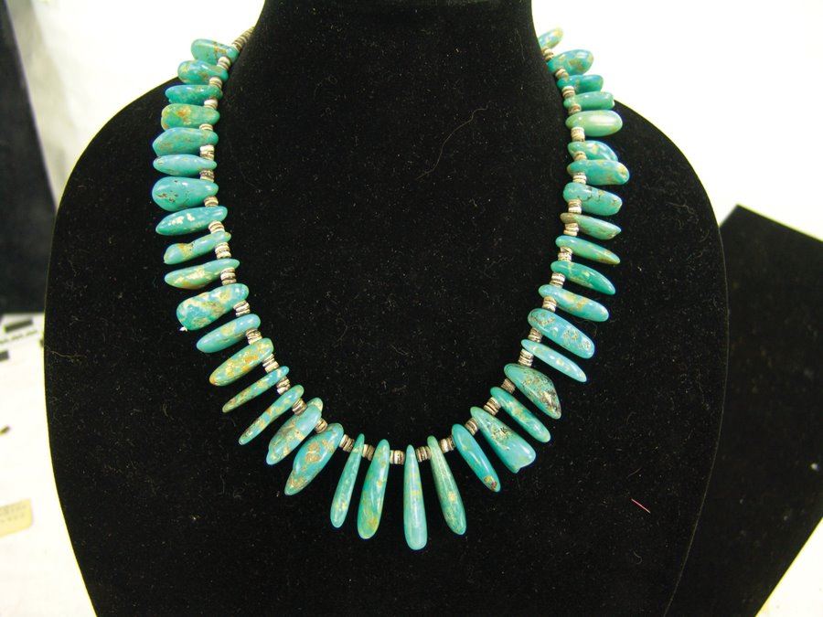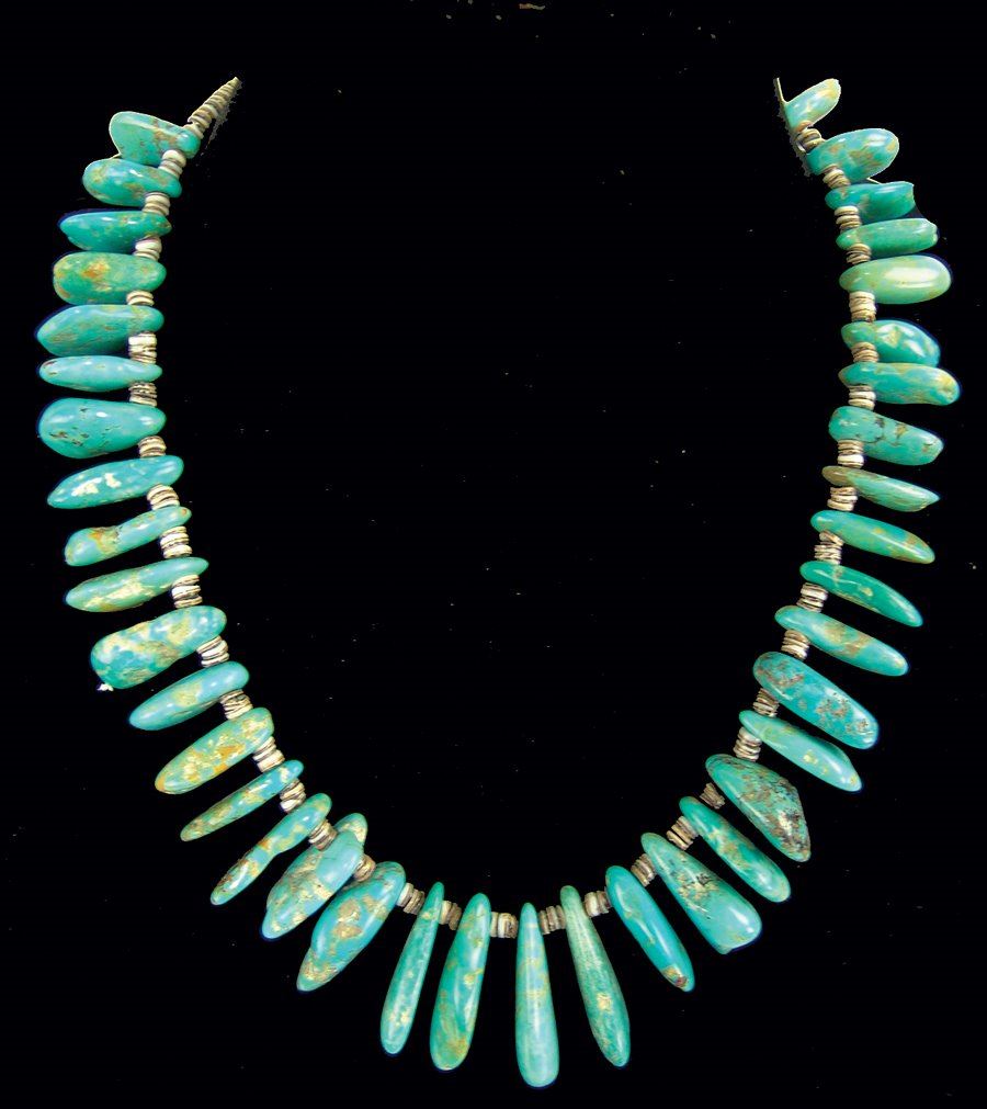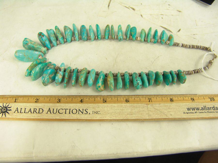 Wonderful shorter length necklace made with 4mm shell Heshi and loaded with polished, graduated pendant-drilled matching green Royston turquoise stones. Very good condition, nice patina.,Ca. 1970s,18"