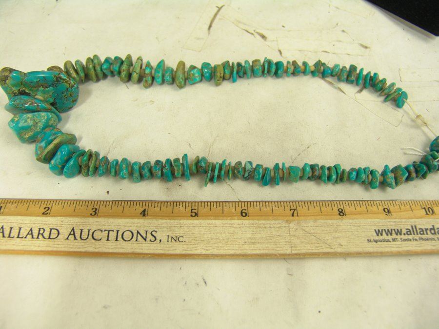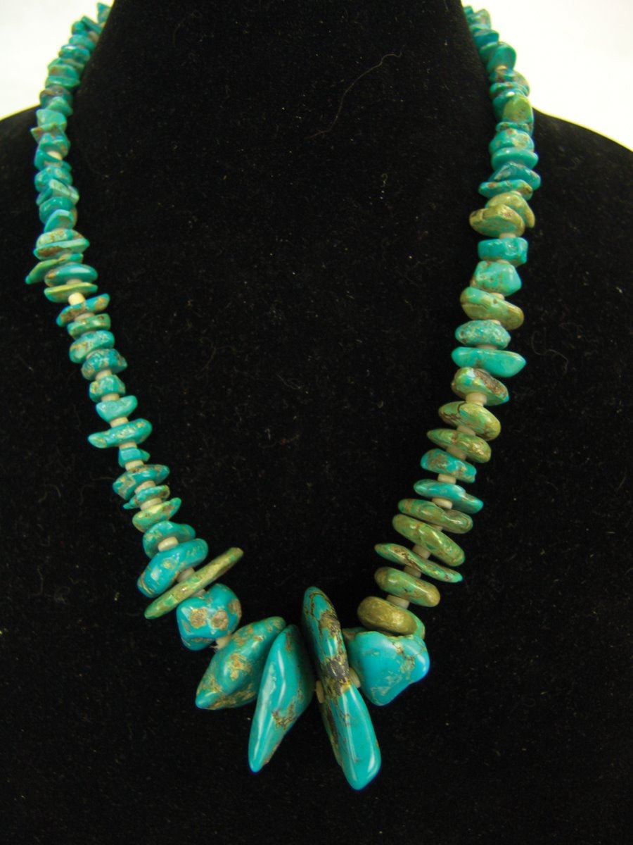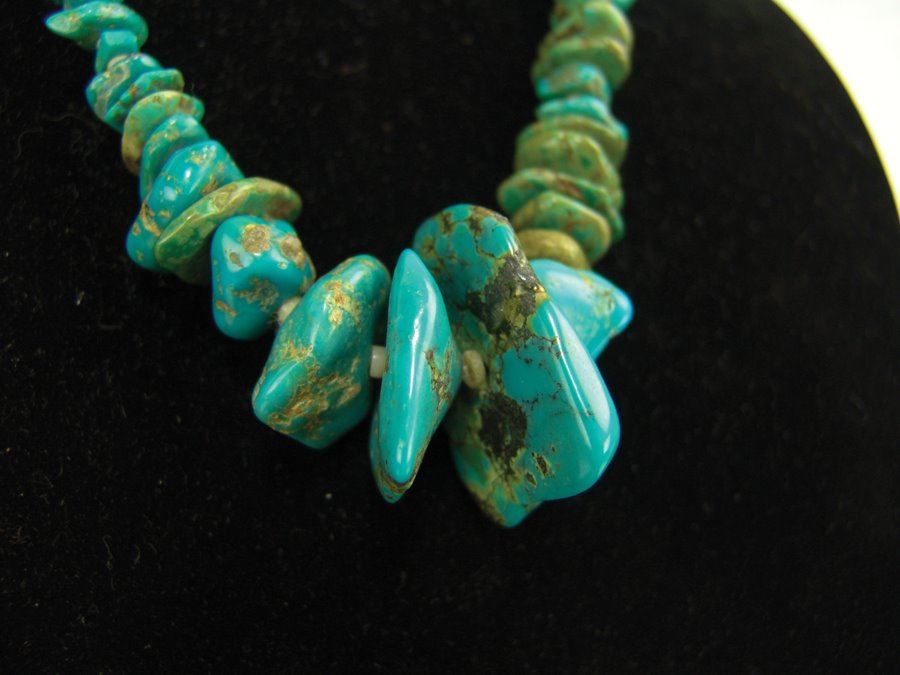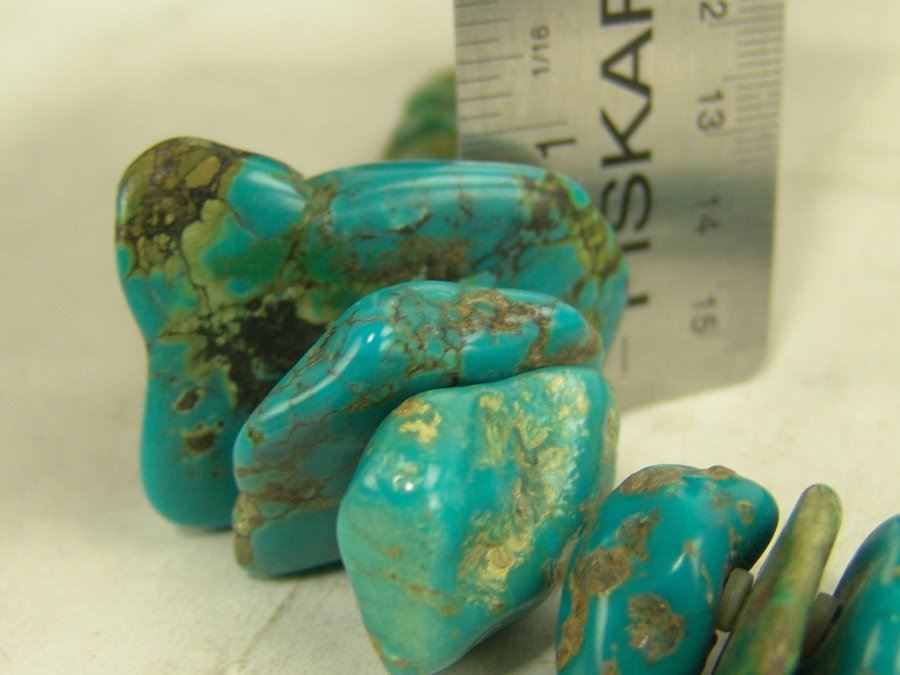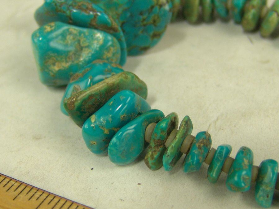 Beautiful, graduated strand of polished turquoise nuggets interspersed with silver shell disc beads. Very good condition.,,21"