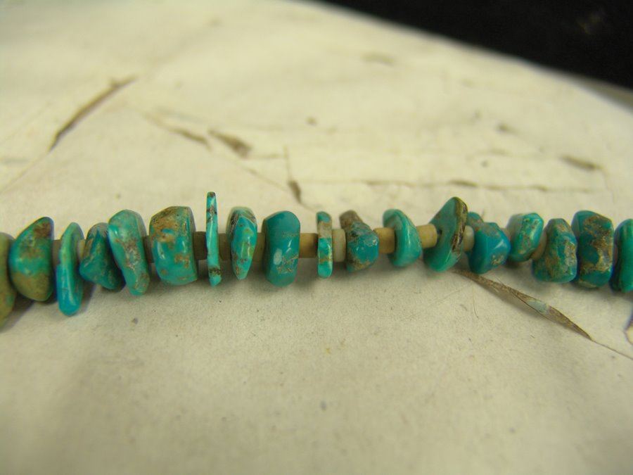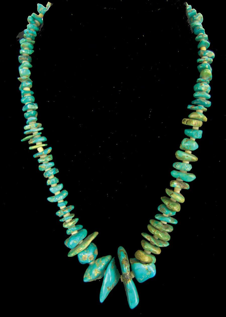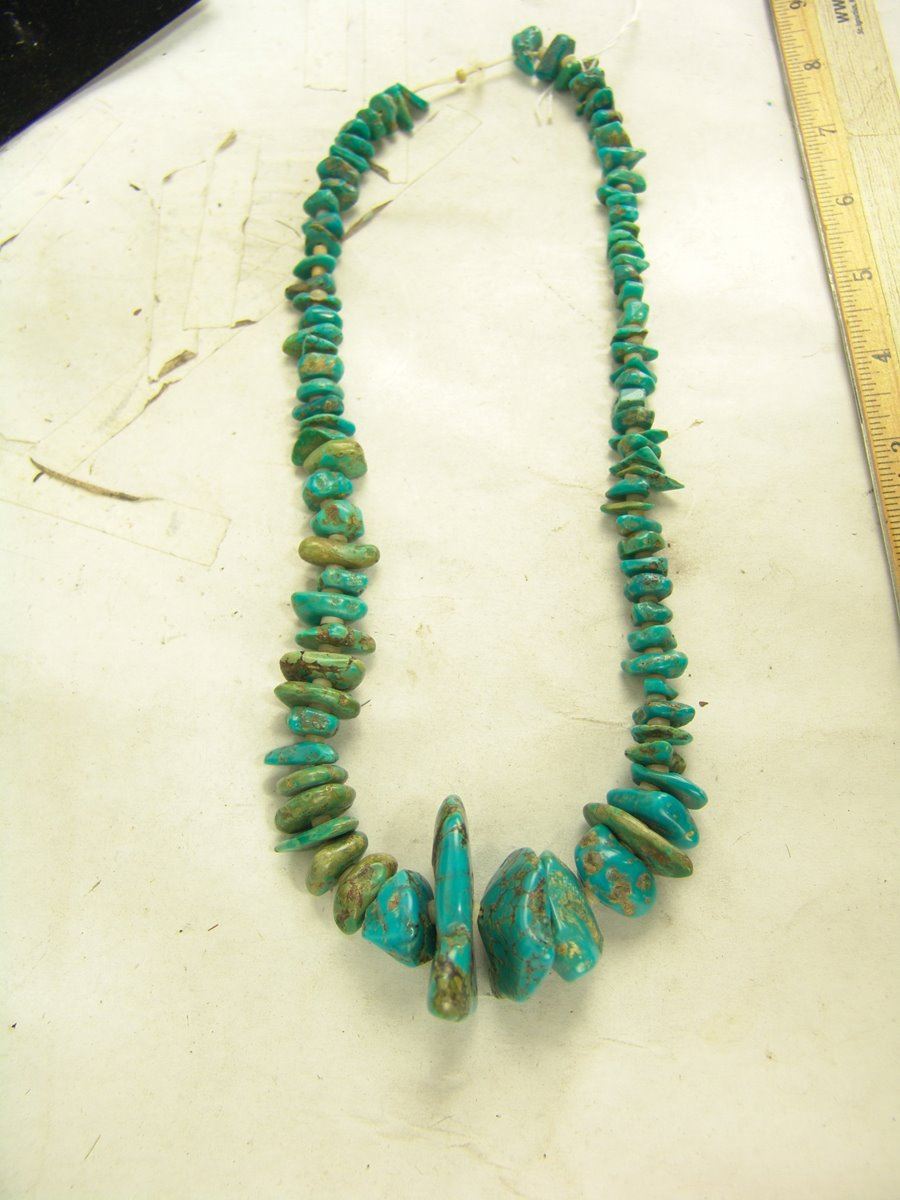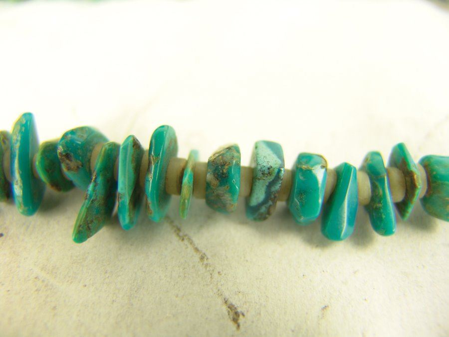 Beautiful, graduated strand of polished turquoise nuggets interspersed with silver shell disc beads. Very good condition.,,21"