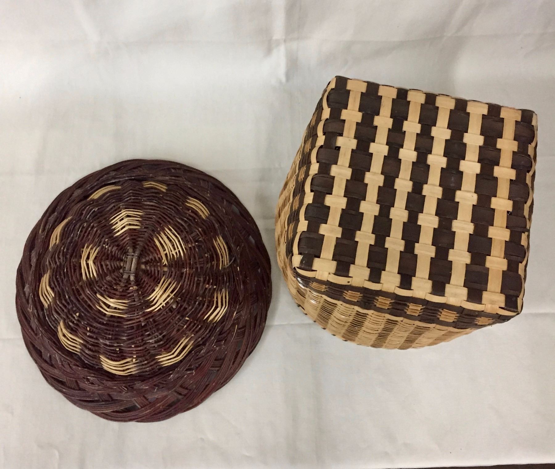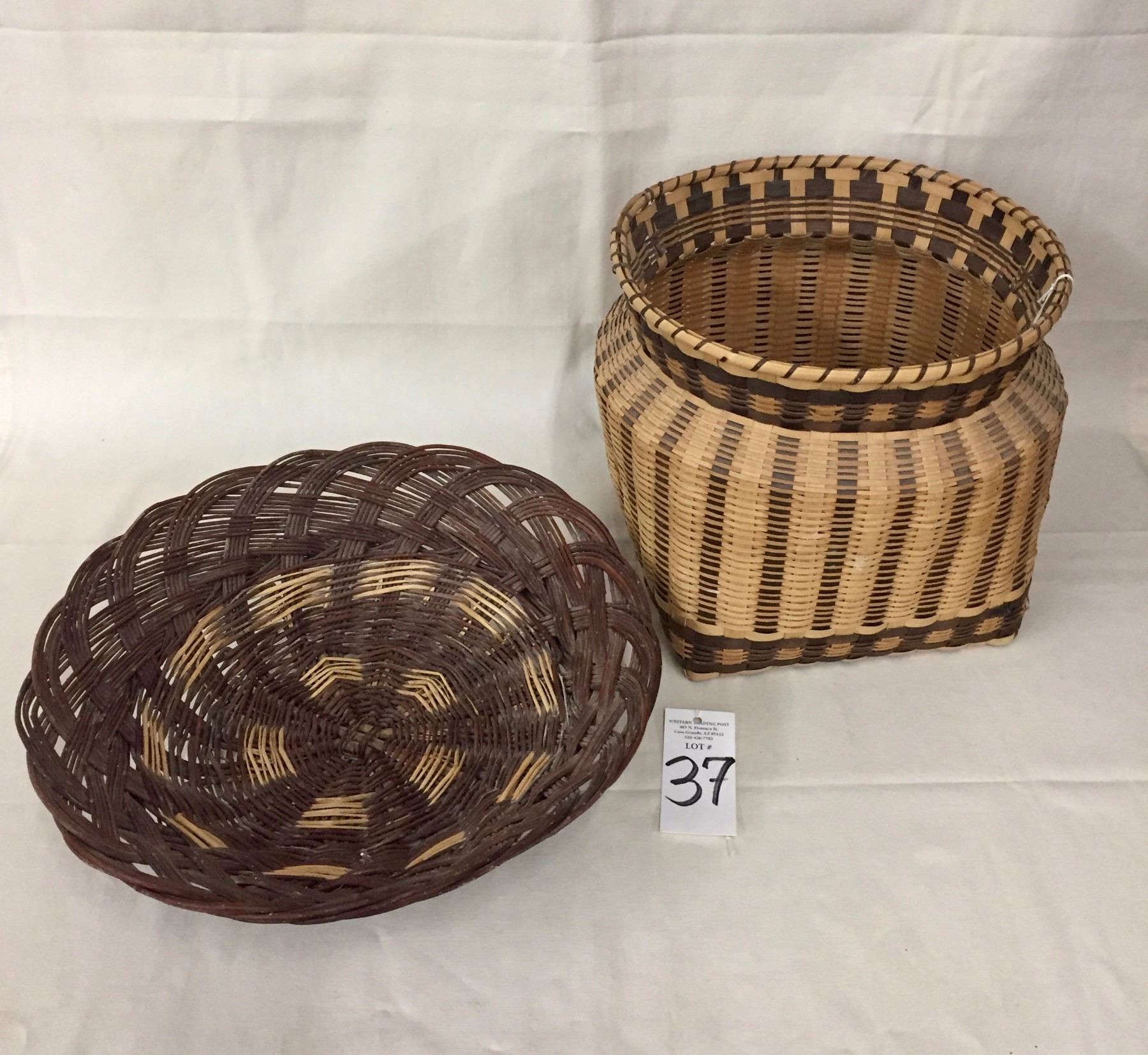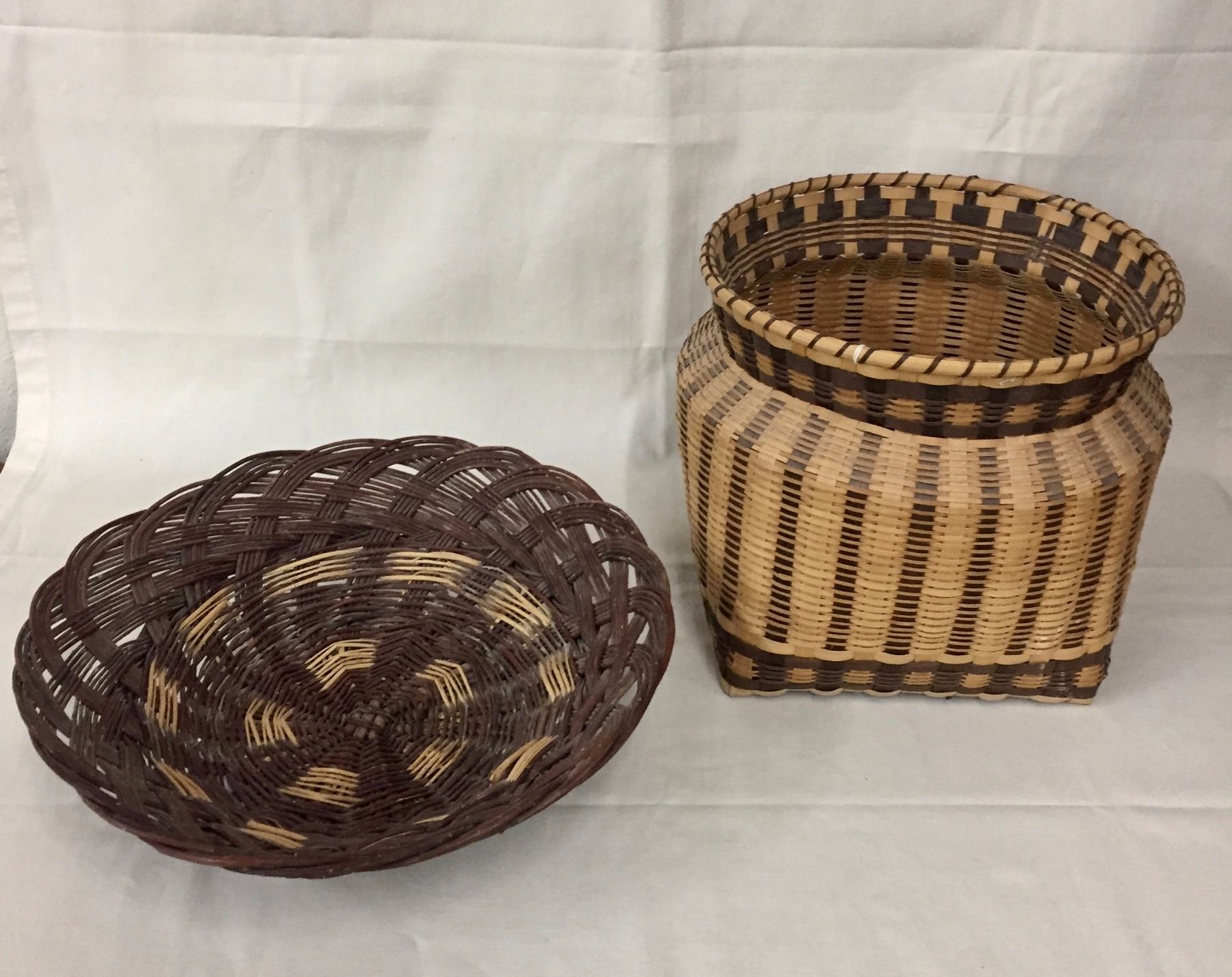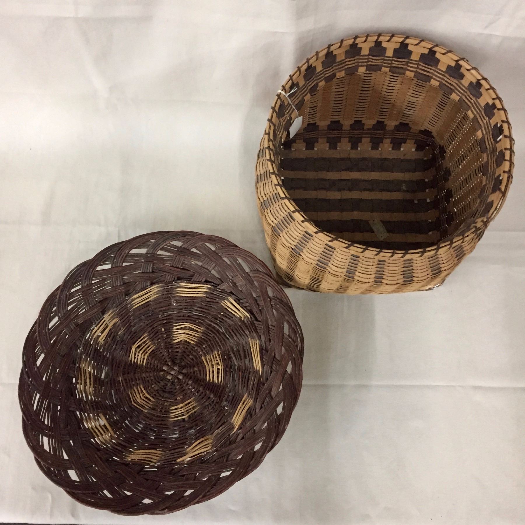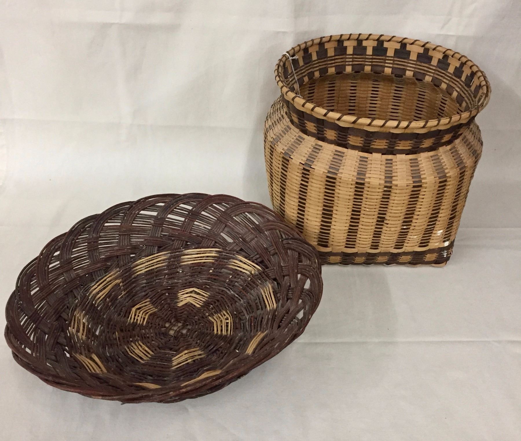 Maker: Unknown Cherokee and Pueblo weavers. Approx. Age: Fairly modern, circa 1980s. Size: 1) 14” w x 11” h. 2) 16” w x 5” h. Additional Info: Pair of Cherokee and Pueblo wicker baskets. Condition: Good for their age, normal wear expected. Please look closely at the pictures - they are an important part of our description. Shipping: There will be a $8 handling / packaging fee for shipping this lot. The actual cost of postage will be added on top of that.