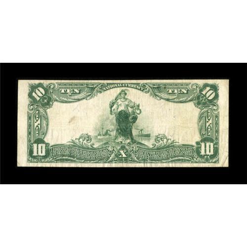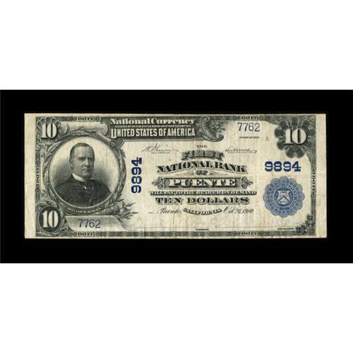 <B>Puente, CA</B></I> - $10 1902 Plain Back Fr. 627 <B>The First NB</B></I> Ch. # 9894<BR> Last year at FUN a similarly graded large note realized over $4000. This pleasing Fine+ has a few tiny margin nicks and barely discernible signatures. <B>Fine+.</B></I><BR><I>From The Kansas City Collection.</B></I><BR><BR><b>Shipping:</b> Coins & Currency (<a target="_blank" href="http://www.heritageauctions.com/common/shipping.php">view shipping information</a>)