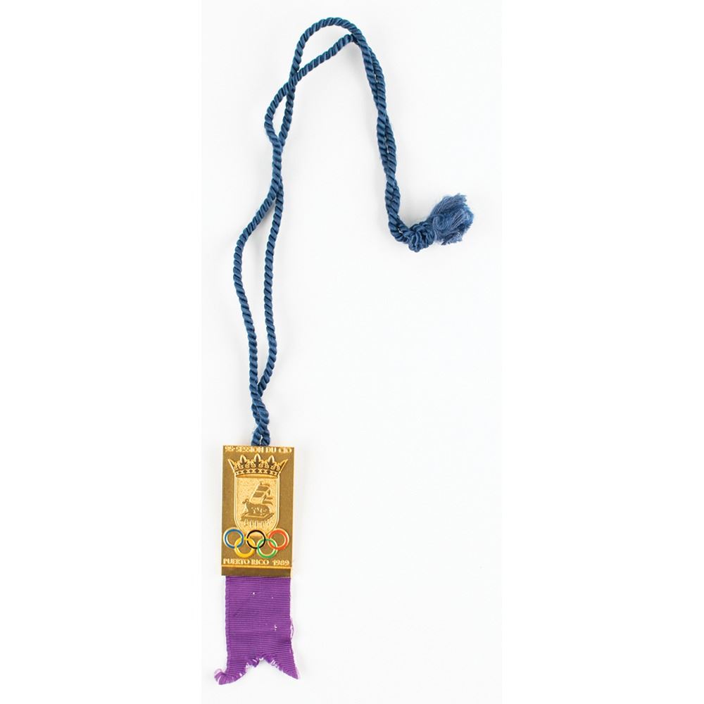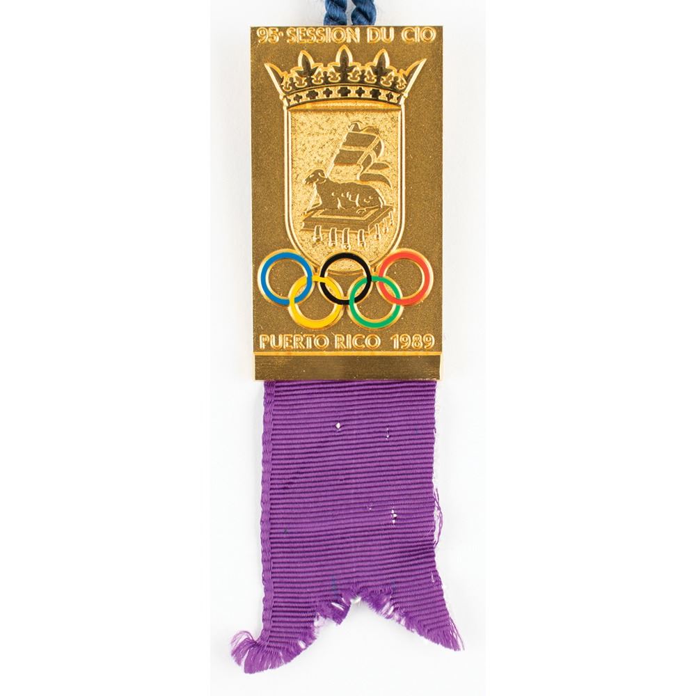 Organizing committee delegate's badge from the 95th International Olympic Committee session held in San Juan, Puerto Rico, in 1989, measuring 35 mm x 55 mm with purple ribbon below, featuring enameled Olympic rings over the city's coat of arms, with raised text reading: "95e Session du CIO, Puerto Rico 1989." Complete with its navy blue cord. Edges of the ribbon are slightly frayed.