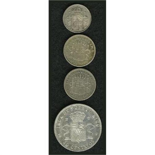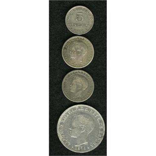 <B>Alfonso XIII of Spain - Quartet of Minors,</B></I> KM20 5 Centavos 1896, nice lustrous VF-XF, KM21 10 Centavos 1896 (2), both toned F-VF, and KM23 40 Centavos 1896, cleaned VF with some typical small surface marks. <B>Sold as is, no return lot.</B></I><BR><BR><b>Shipping:</b> Coins & Currency (<a target="_blank" href="http://www.heritageauctions.com/common/shipping.php">view shipping information</a>)
