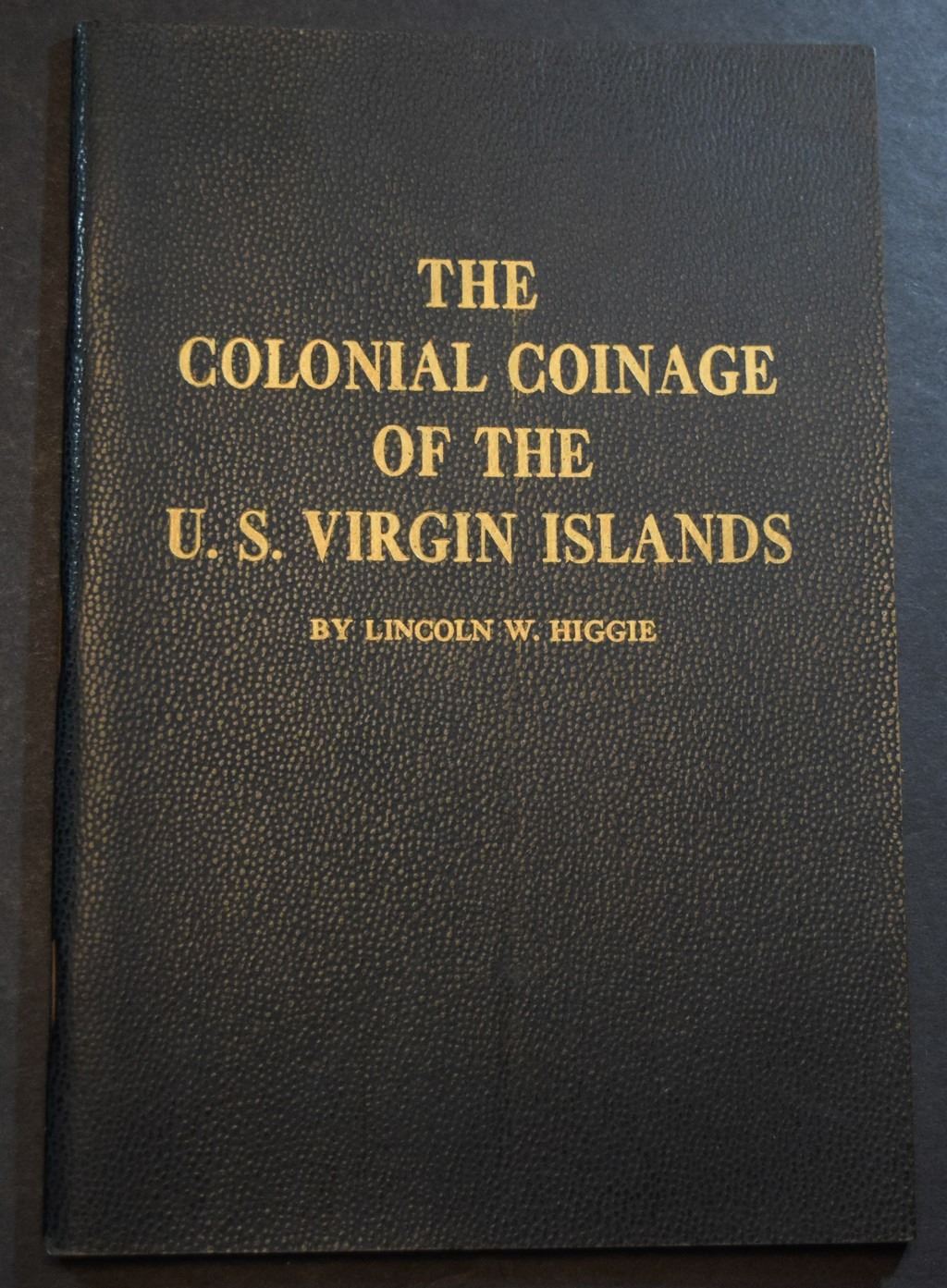 (5) The Colonial Coinage of the U.S. Virgin Islands by Higgie, Lincoln W. Whitman Publishing Company. 1962. 12mo. 61 pages. Original black card covers, lettered in gilt. Fine. b&w plated throughout. Bibliography. This book is an illustrated history and guide to the coins, tokens and paper money issued for the U.S. Virgin Islands under Danish and United States administration... All prices indicated in this book are based on rarity, auction records, private sales and dealer estimates. Topics covered are counterstamped coins, gold ducats, coins of the Danish West Indies, merchant's tokens, and Danish West Indies paper money. Lot weight: 1 lbs 0oz. Subject(s): Coinage - Puerto Rico, West Indies.