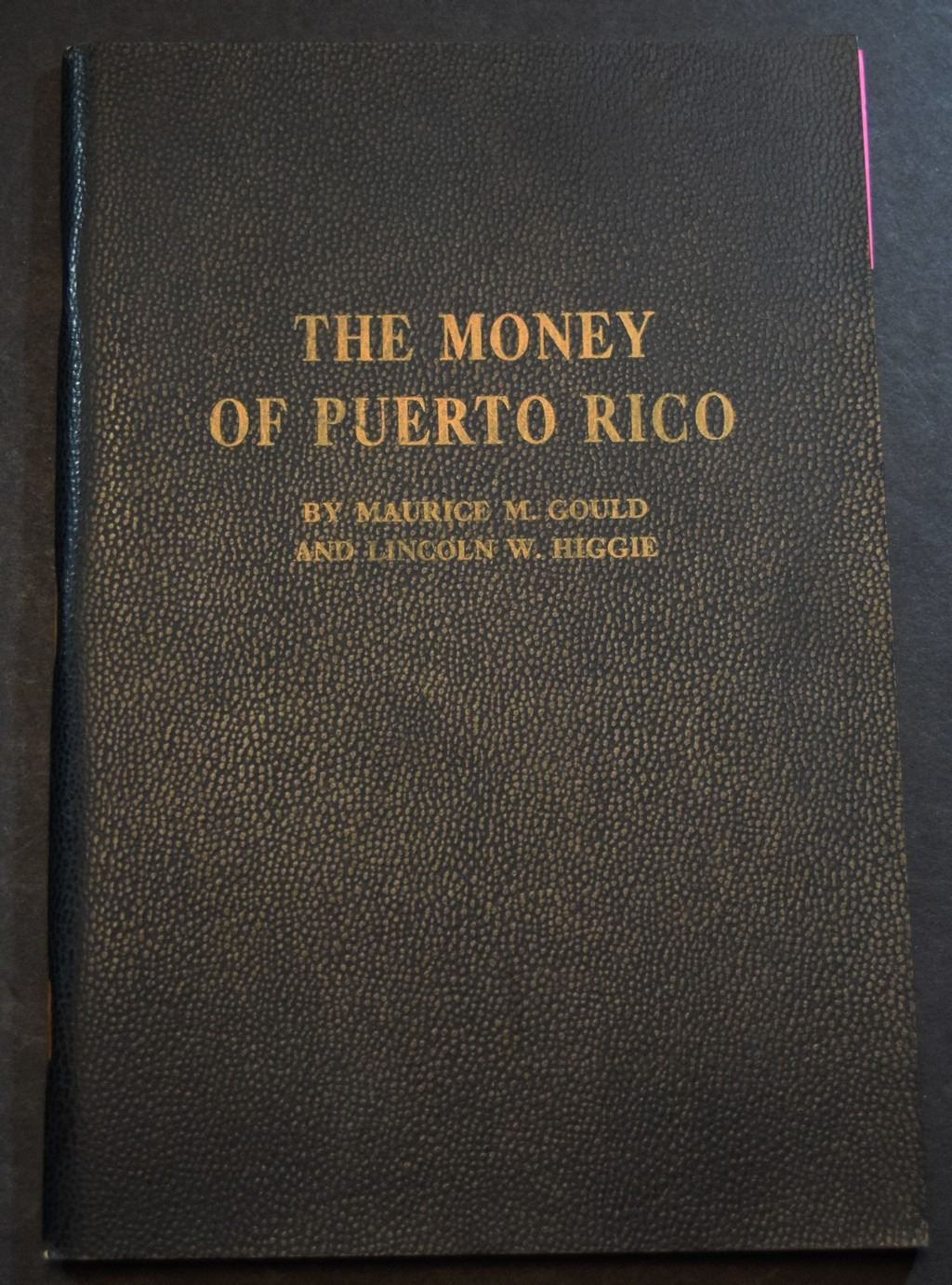 (1) The Money of Puerto Rico by Gould, Maurice M. & Lincoln W. Higgie. Whitman Publishing Co. 1962. 12mo. 83 pages. Original black card covers, lettered in gilt. Fine. b&w plated throughout. Bibliography. This book is an illustrated history and price list of the coins, tokens and paper money which were once issued for use by the commonwealth of Puerto Rico. There are sections on counterstamped coins, the coinage of 1895-1896, paper money, and a heavy emphasis on plantation and merchant tokens.